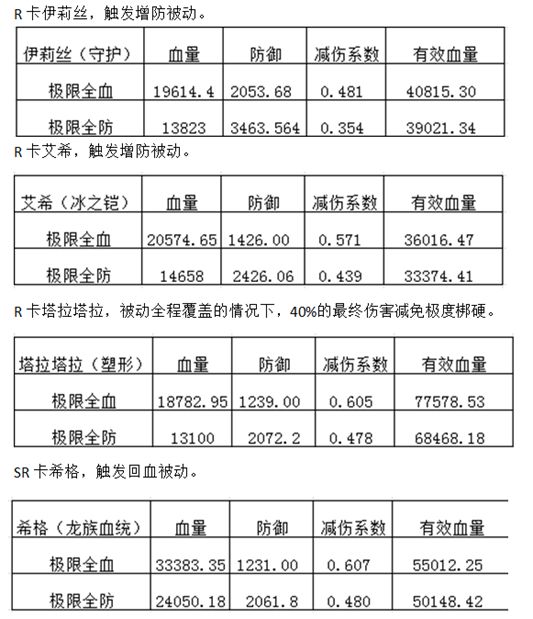接下来是同等装备条件下,其他盾职角色的有效血量,因触发条件和应用场景各有不同,笔者也不建议以此将各角色作横向比较。