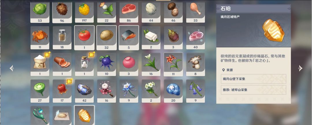 原神中的石珀共有137处刷新地点,分散于大地图的各地,由于石珀较为集中分布在琥牢山、绝云间、地中之盐等区域,我们可以合理设计一条从琥牢山一路向右的采集路线,沿着这条采集路线可以一次性获取超过30个石珀。