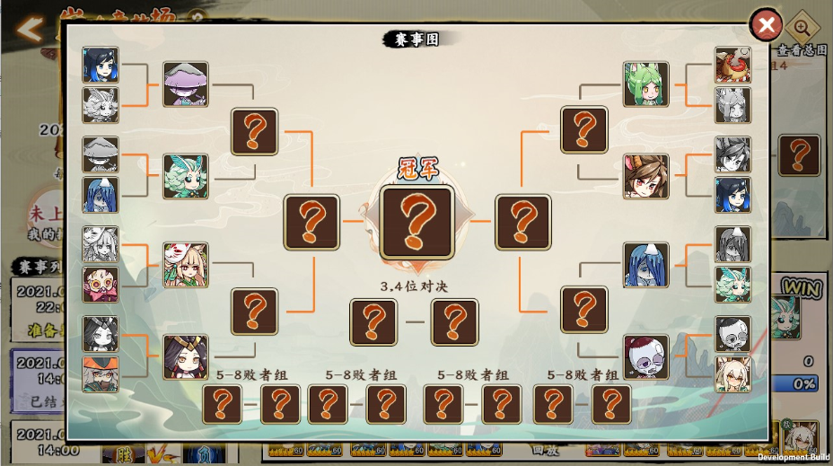 进行比赛之前一段时间分为准备期,竞猜期。准备期参与比赛的16名玩家进行阵容调整;竞猜期所有玩家均可参与竞猜,选择花费勾玉支持对应赛事的双方任意一方,胜利方可以瓜分总奖池,失败方也可获得一定数量的奖励。