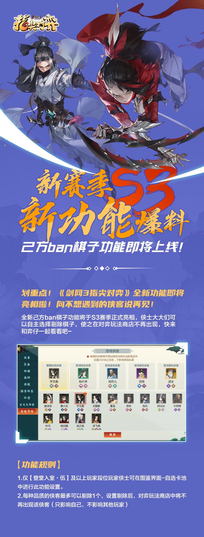 不想遇见的棋子总是遇见?己方ban棋子功能助你解决这个问题!此功能上线后,各位侠士可在开战前选择不想使用的棋子,被选择的棋子在该局中不会出现在【自己】的商店中!具体详情请戳下图!↓