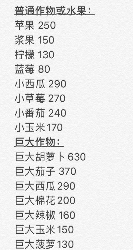 普通作物或水果:苹果 250 柠檬 130 蓝莓 80 小西瓜 290 小草莓 270 小番茄 240