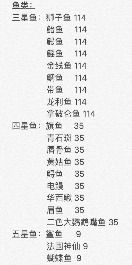 五星鱼由于之前很多人任务卡住了,所以数据不足,现在看来,应该是所有鱼类都会抽到,不过数量是统一的, 三星114条、四星35条、五星9条.