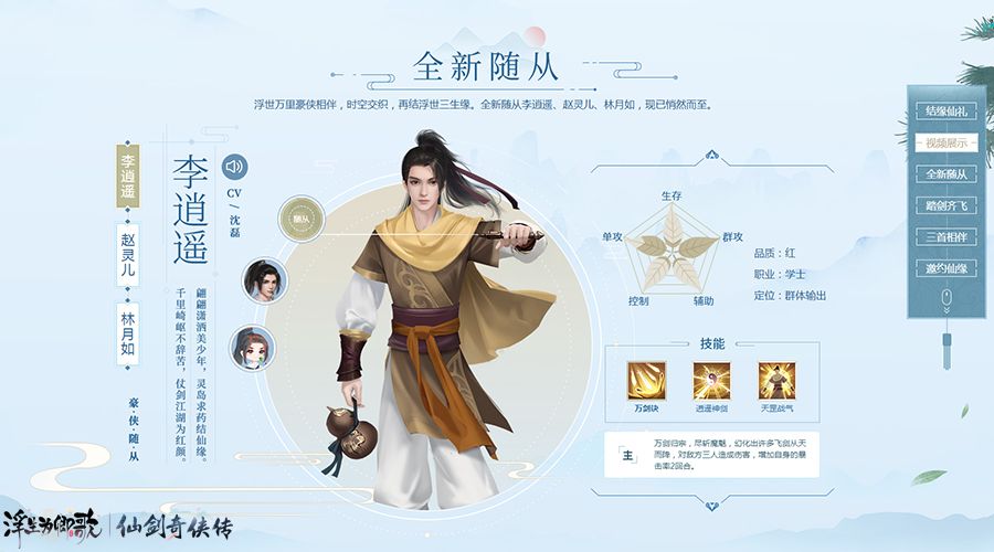 时空交织,再结三生六界之缘!《仙剑奇侠传》人气随从即将跨界而来,李逍遥、赵灵儿、林月如即将震撼登场。山河斗酒,倚剑逍遥,李逍遥化身学士,为浮世天地斩妖除魔!五气朝元,普度众生,赵灵儿化身尚食,力保阁下浮世探索之路!心无瑕秽,明镜澄清,林月如化身侍卫,为阁下尽心守护珍视之人,感受独一无二的仙侠之旅!
