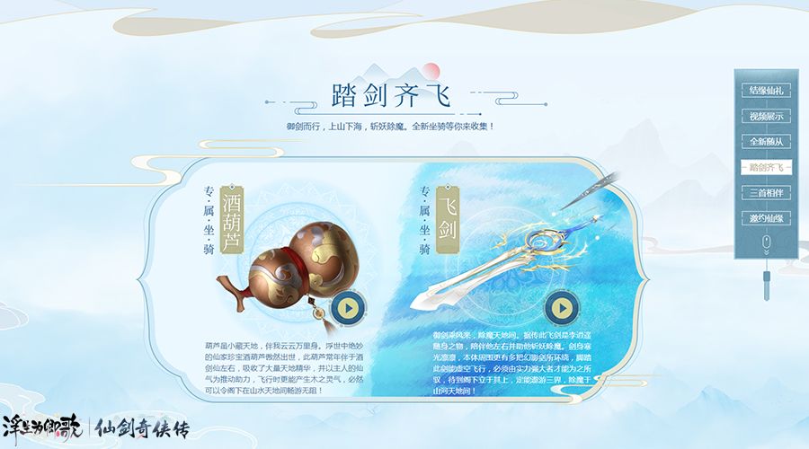 上天入地,斩妖除魔!《浮生为卿歌》×《仙剑奇侠传》专属联动坐骑即将御风而来!飞剑现世,除魔天地间,据传此飞剑是李逍遥随身之物,伴其左右并助他斩妖除魔。剑身寒光凛凛,本体周围更有多把幻影剑所环绕,脚踏此剑能虚空飞行,待到立于其上,定能遨游三界,除魔与山河天地间!酒剑仙之宝,酒葫芦傲然出世,此葫芦常年伴与酒剑仙左右,吸收大量天地精华,并以主人的仙气为推动助力,飞行时更能产生木之灵气,必然可以令阁下在山水天地间畅游无阻!