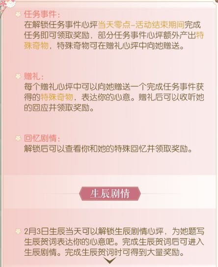 旅妹的心坪分为:任务事件、赠礼、奖励、生辰贺词。