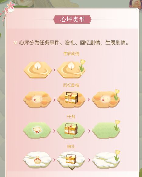 不同的心坪代表了阿离不同的心境,里面藏着你和她专属的独家记忆。完成一格后可以使用道具芍药解锁相邻的心坪。