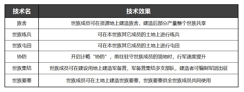 本赛季中,城池不再提供资源加成,而是需要玩家通过在资源领地上修建特殊建筑如“族舍”,为世族成员提供加成,世族与个人,也形成一种休戚与共的关系。同一个世族中,玩家还可以通过其他成员的土地进行练兵、屯田,或者使用其他成员的要塞调动兵马,为玩家提供了一种比此前同盟更加密切的合作关系。