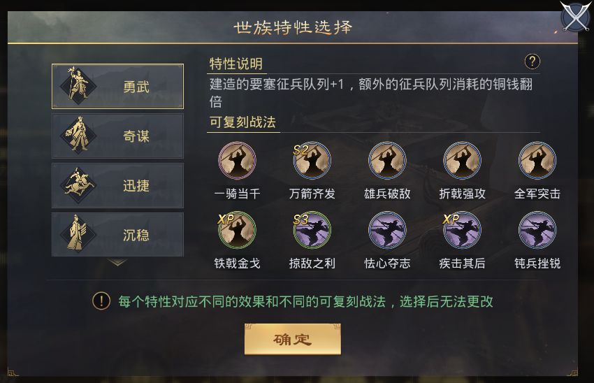 经学世家,奇谋制胜,豪右门阀,勇武破敌,不同的世族特点各异。世族达到一定等级后,将解锁世族特性,作为族长的玩家可为本世族选定一个特性,特性对应不同的效果,或前线冲锋,或驻防维稳,尽显世族特色。此外,不同特性还对应若干可拓印战法,拥有可拓印战法并消耗铜钱即可完成拓印,拓印的战法与原战法效果一致。玩家通过拓印额外获得的战法,将为战法搭配和武将组合带来更多变化。