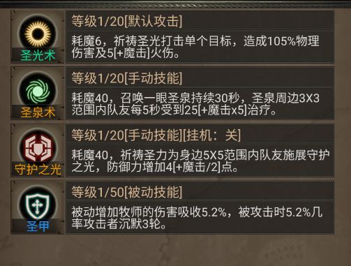 玩法介绍:因为叫牧师,所以刚开始玩的时候选择的玩家比较少,让他成为最少玩家选择的角色。但是在游戏中期成为游戏中必不可少的角色,游戏中最重要的攻击方式是平A,初始平A伤害4种职业都是差不多的,使得4个攻击力都差不多,但是牧师能加攻加血加防减甲变羊,游戏中攻击和防御很重要,由于牧师技能增加很多,使他虽然没有直伤技能,但是单挑缺不比别的职业弱,由于增益是群体范围内队友都有,还能使敌人变羊,使他在高级副本中成为必不可少的角色,由于增益效果很多都是可以挂机时自动施放,使他和周围队友挂机时效率提升