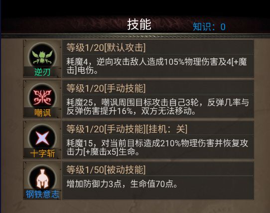 玩法介绍:拥有强力的初始被动,初始主动技能十字斩的强力伤害还有回血让他在前期有着不俗的战斗能力,雷霆一击和冲锋让他同时有着控制效果,冲锋在高级本中被控制时可以吧Boss顶出Boss攻击队友的攻击范围,让队友免于一死,由于怪物不会自动回血,可以修整后重新战斗,但是自己可能会死,初始技能嘲讽也略显呆逼,冲锋用不好可能会影响队友之间的配合,比如法师放火墙术你把Boss顶走了,普攻Aoe伤害也比其他职业相对少一些