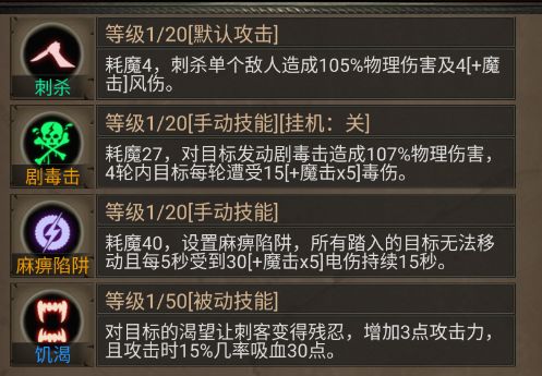 玩法介绍:作为本游戏最热门的角色,初始被动饥渴的吸血让很多玩家对他爱不释手(其实前期用处不是很大,前期回血主要使用药品)。高额的单体伤害使他成为刷怪效率最快的角色,初始主动技能剧毒击可以挂机的时候自主释放,疾风是挂机时候可以自主释放,强力的技能让他成为挂机一霸,挂机效率遥遥领先其他角色,剧毒击的毒伤让他打boss也能造成巨额伤害。