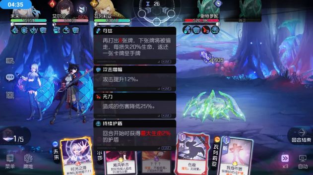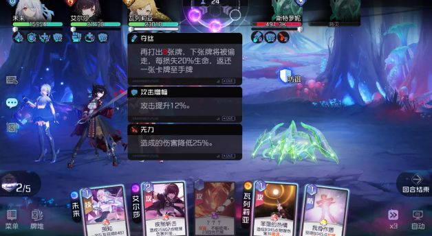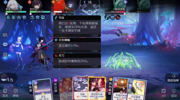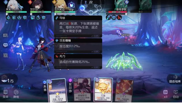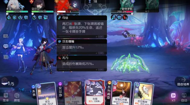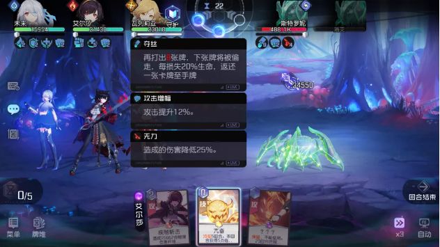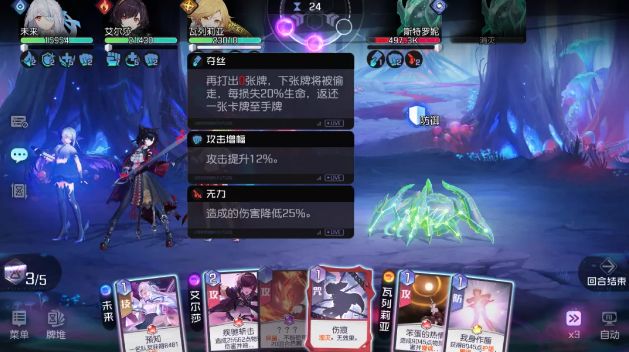 (打出前后状态对比)攻略君解读:BOSS偷1张攻击牌,获得2层攻击增幅(整场战斗攻击提升12%)。