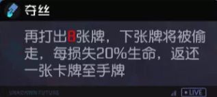 夺丝:BOSS会“偷走”角色打出的第9张卡牌。每掉20%的血就会“吐”给角色一张卡牌。