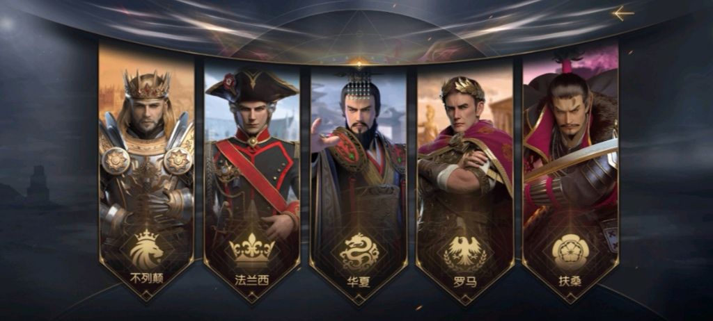刚进入游戏一共5个文明进行选择,不列颠、法兰西、华夏、罗马、扶桑,对应现实应该就是英国、法国、中国、罗马、日本了。