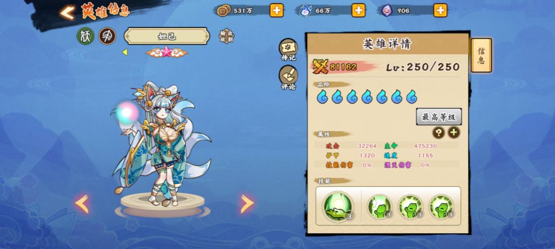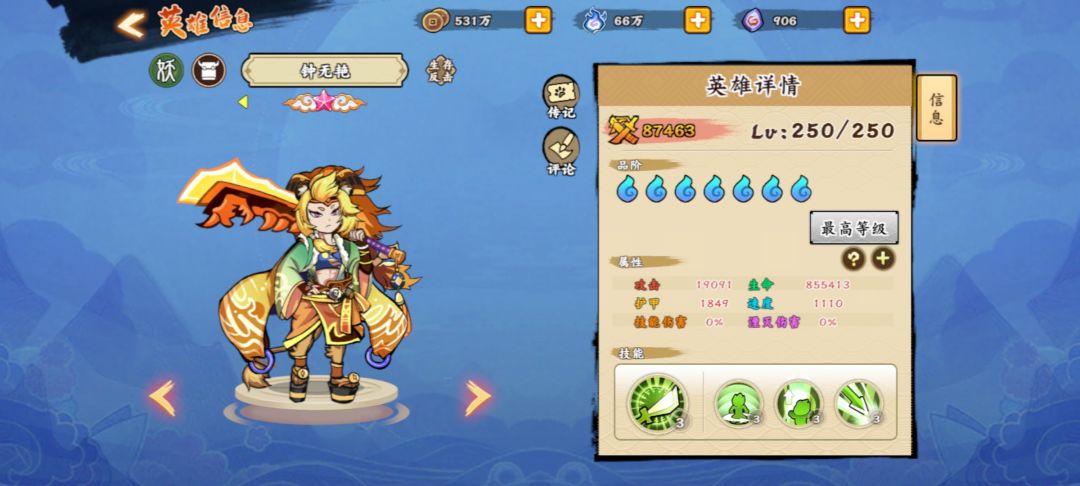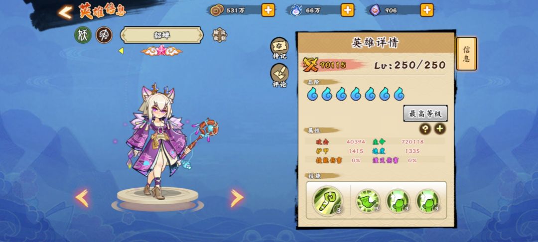 综合评价:萌新前期可以将其培养到6星,作为开局过度的妖灵,后续作为妖族六星狗粮使用。当然妖族主要培养目标还是貂蝉。