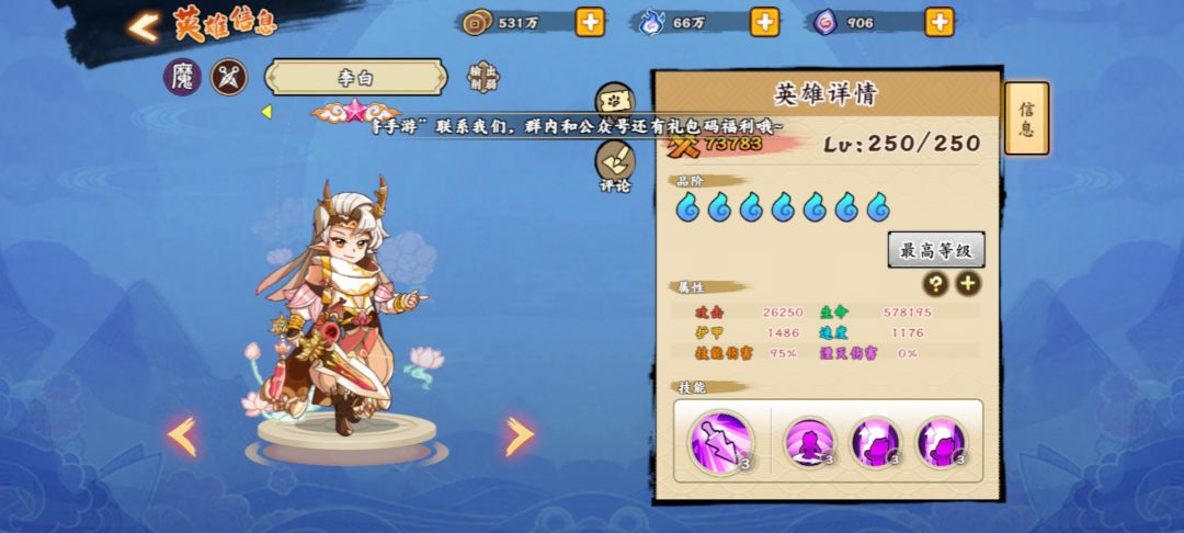 综合评价:十星高属性下才能发挥效果,萌新不要培养,可以留存在手中,日后再考虑培养情况。但如果缺魔族狗粮,可以将李白作为狗粮使用。