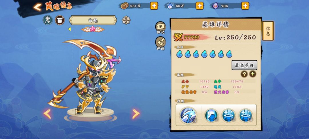 综合评价:不需要培养白起,鬼族狗粮,性价比极低。萌新请不要投入资源,最多培养到六星前期过度。