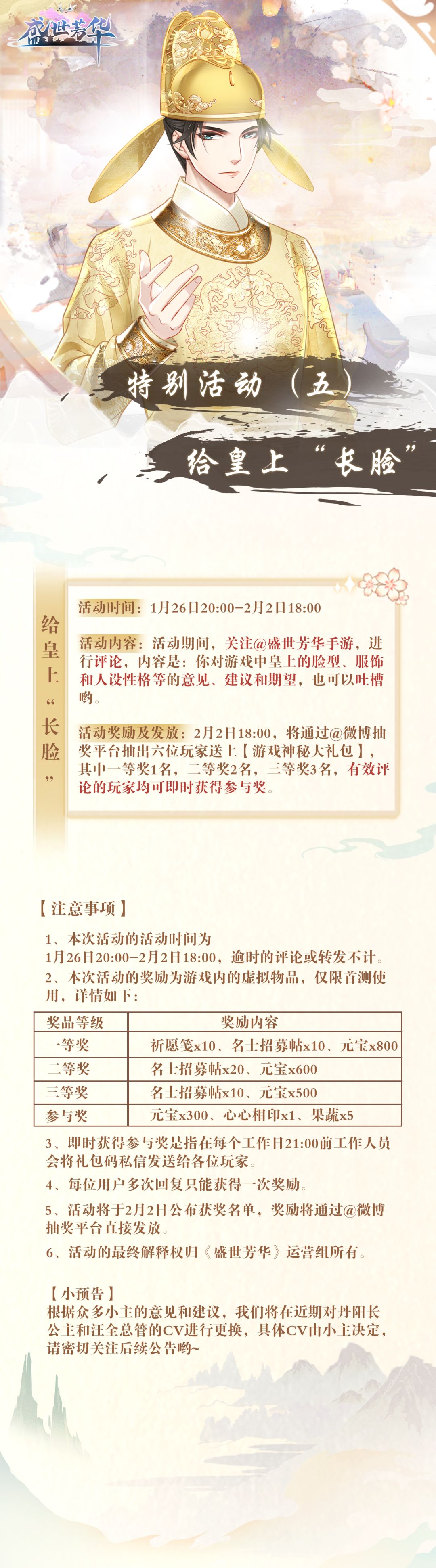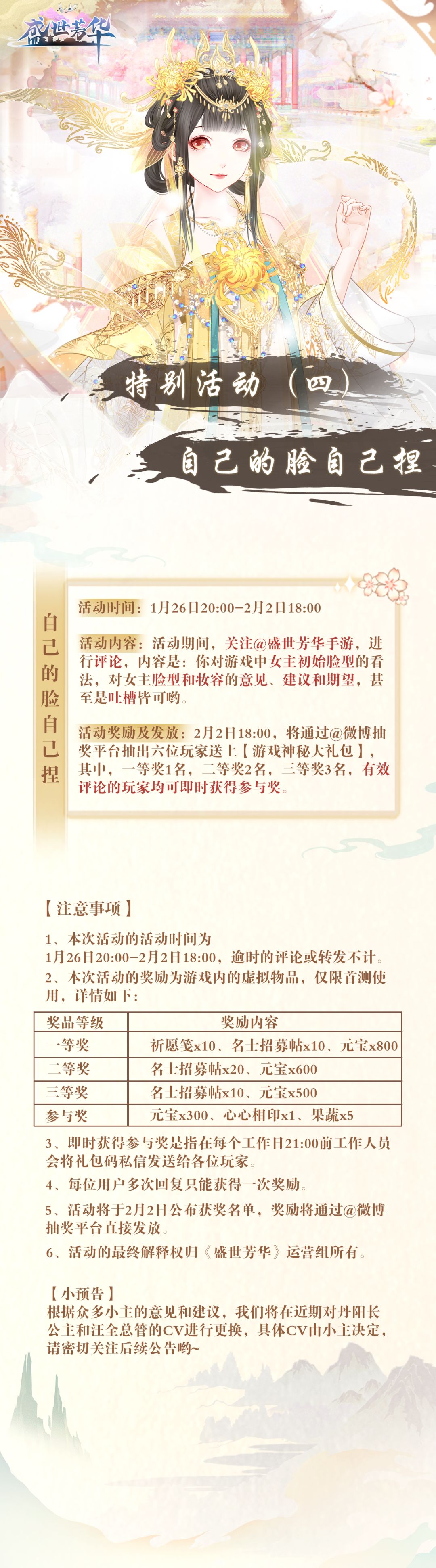 活动详情请各位小主移驾关注游戏官方微博@盛世芳华手游 了解,关注即送礼包,更有其他活动和奖励不定期放出哦。