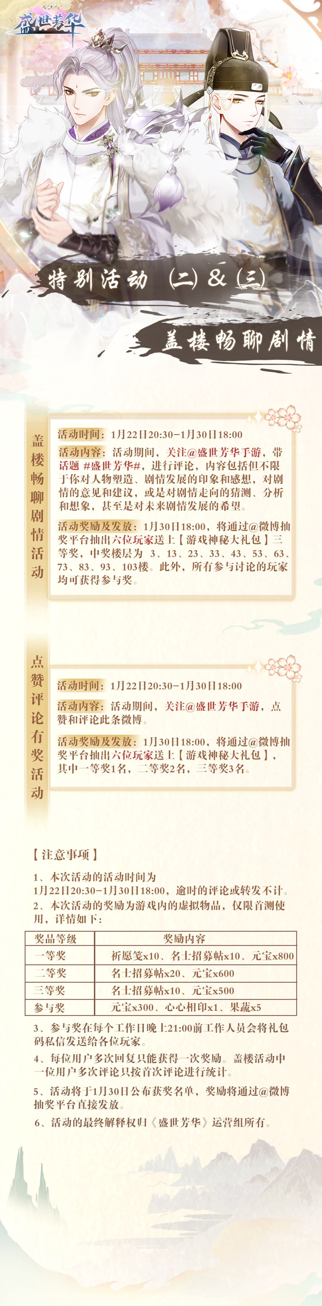 3、为《盛世芳华》打call:关注转发官微博文,一起来把芳华世界的社区构筑得更加热闹和谐吧!