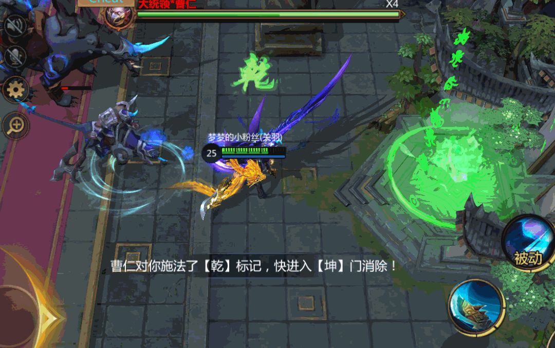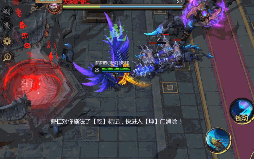 曹仁会给玩家打上“乾”或者“坤”的标记,持续9秒,如果未及时消除标记,则会产生爆炸,对所有玩家造成40%血量上限的伤害,同时被标记的玩家会陷入昏迷。