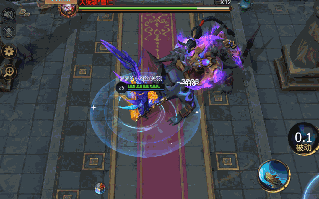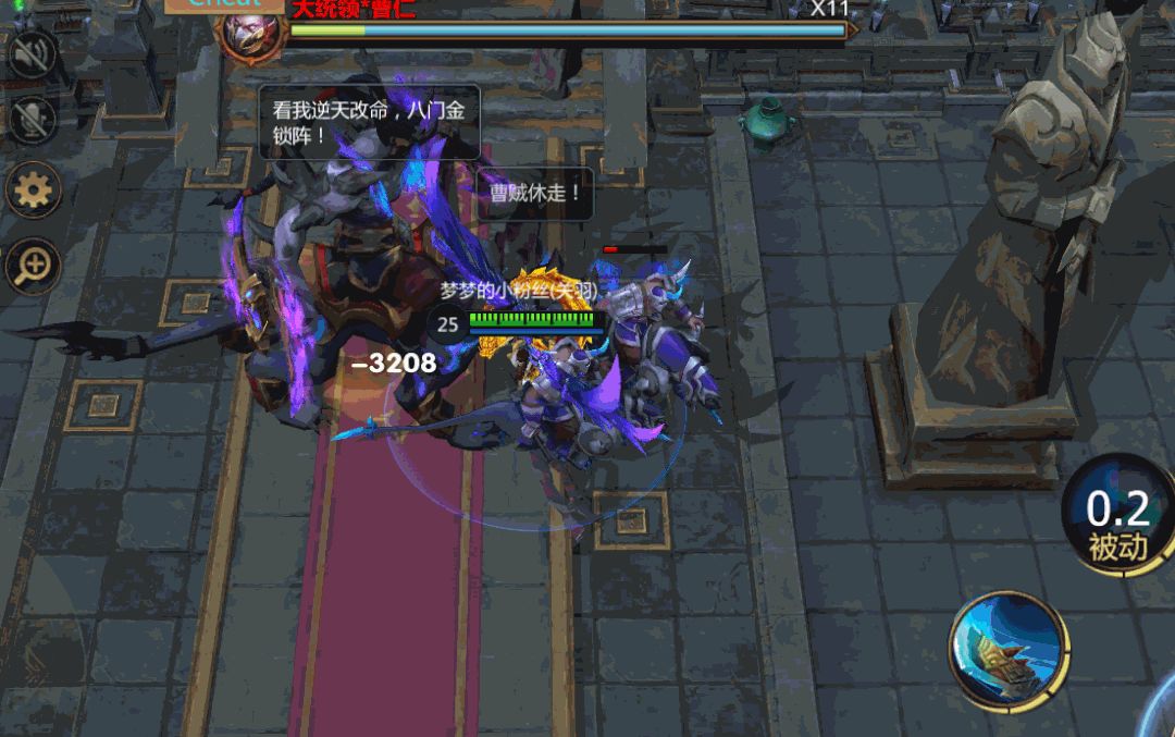 每隔一段时间,曹仁会隐身并随机在战斗区域地点释放暗影飞斧技能,同时召唤5个虎豹骑。