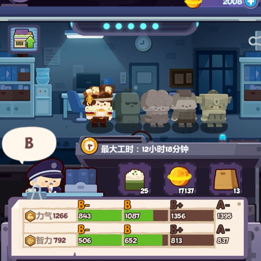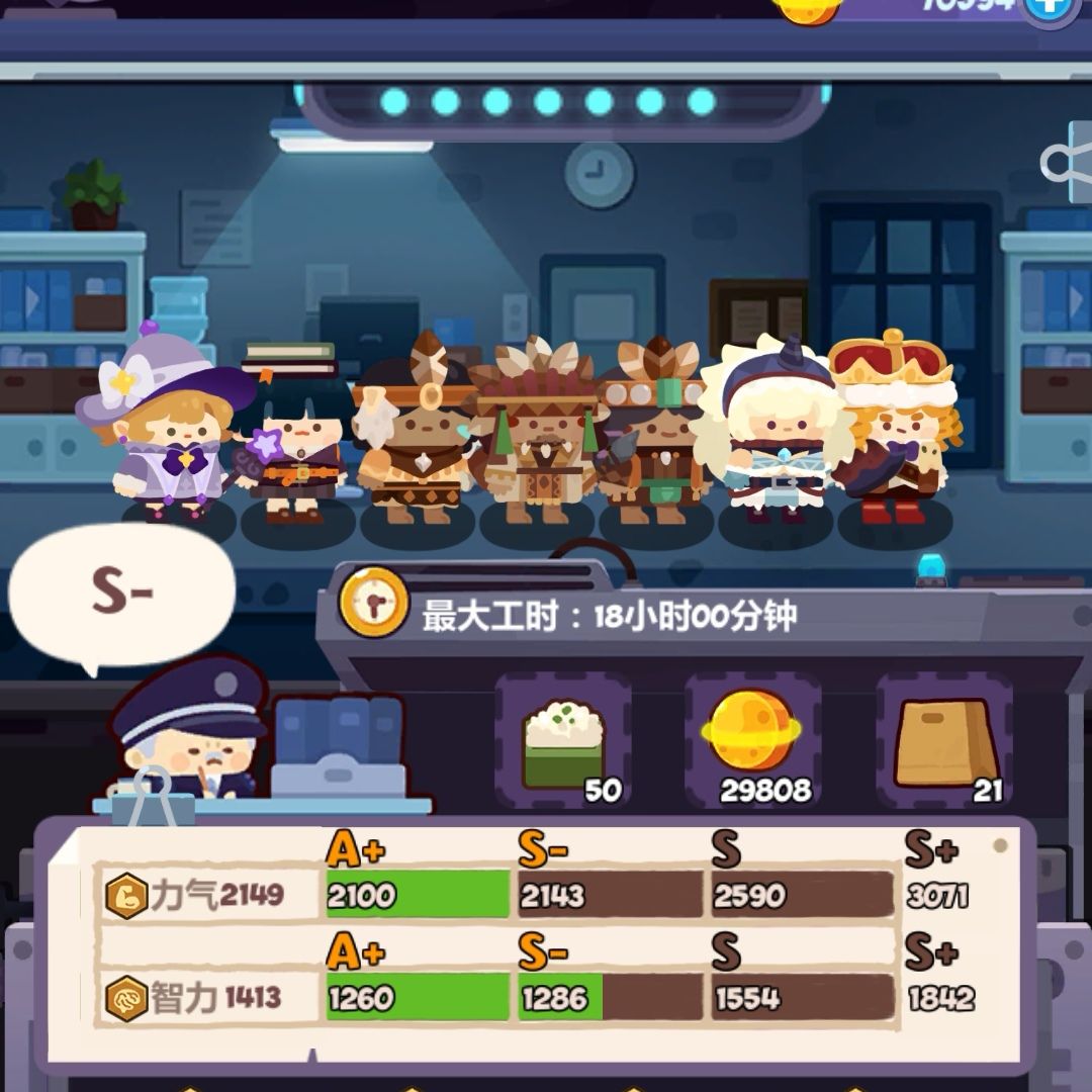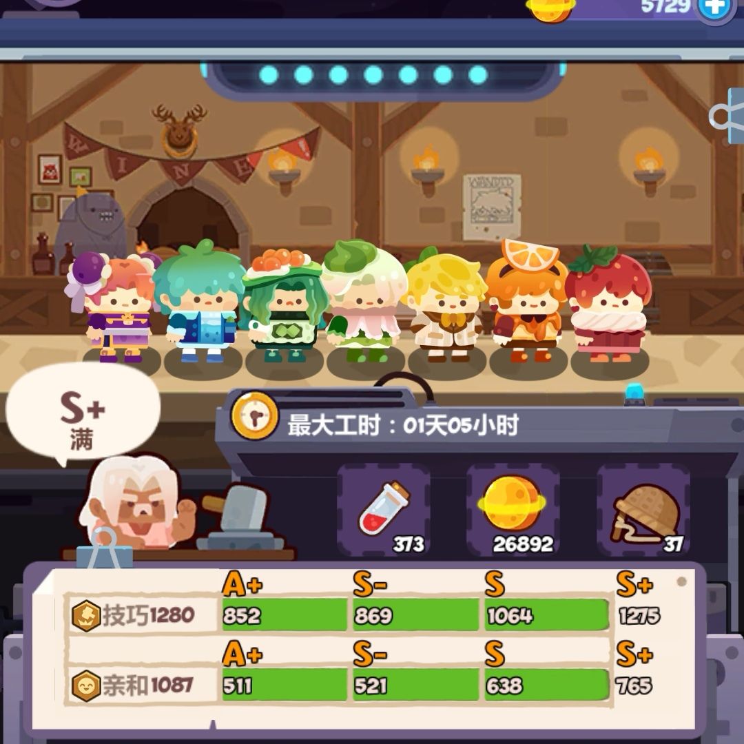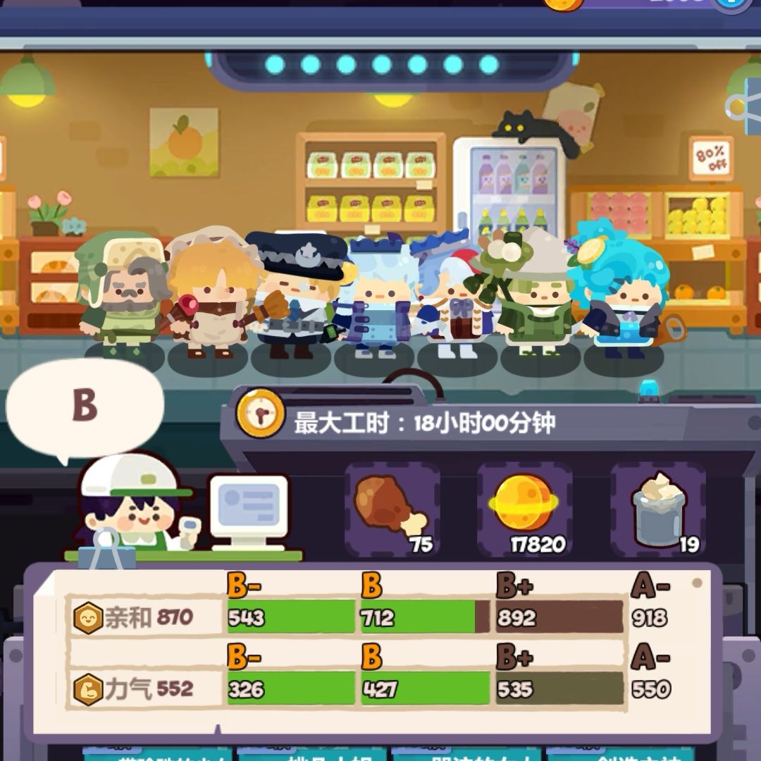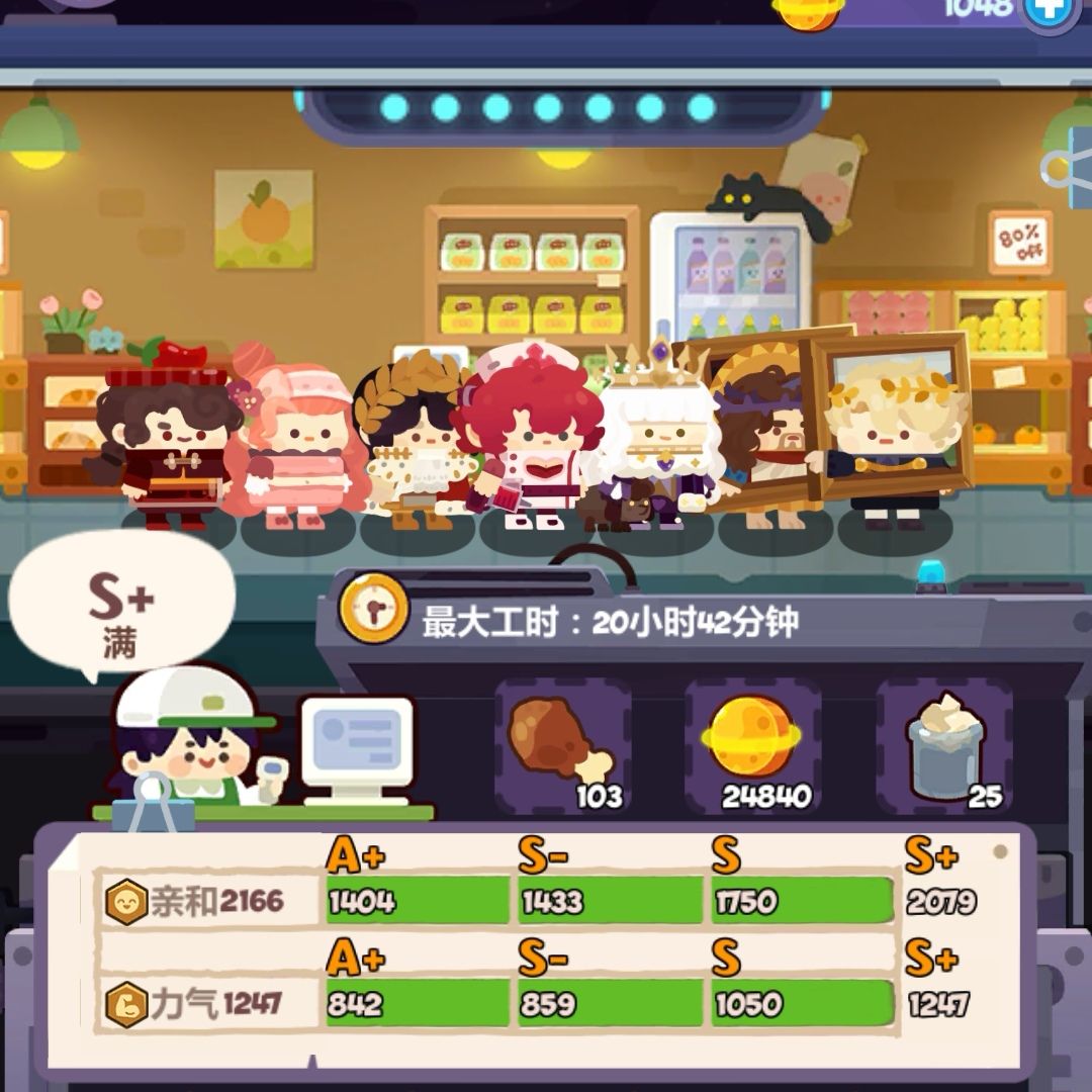 超市打工仔以亲和为主力量为辅,值得一提的是要到达同样的评级,超市所需要的属性要比道具店高,比如道具店S级需要技巧值1064,而超市A级就已经需要亲和值1155,要到达A+则需要亲和值1404,换言之7个打工仔平均每个要提供200+的亲和值。