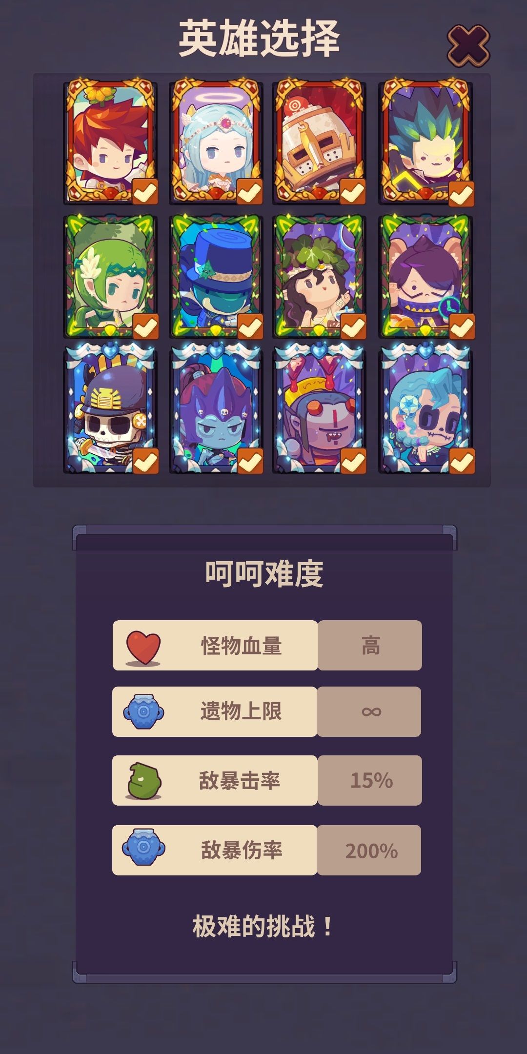 感觉这游戏还是兵种最重要,其他的太看脸了,第一关拿 近战暴击率25% 和 加800血 的遗物就很稳。