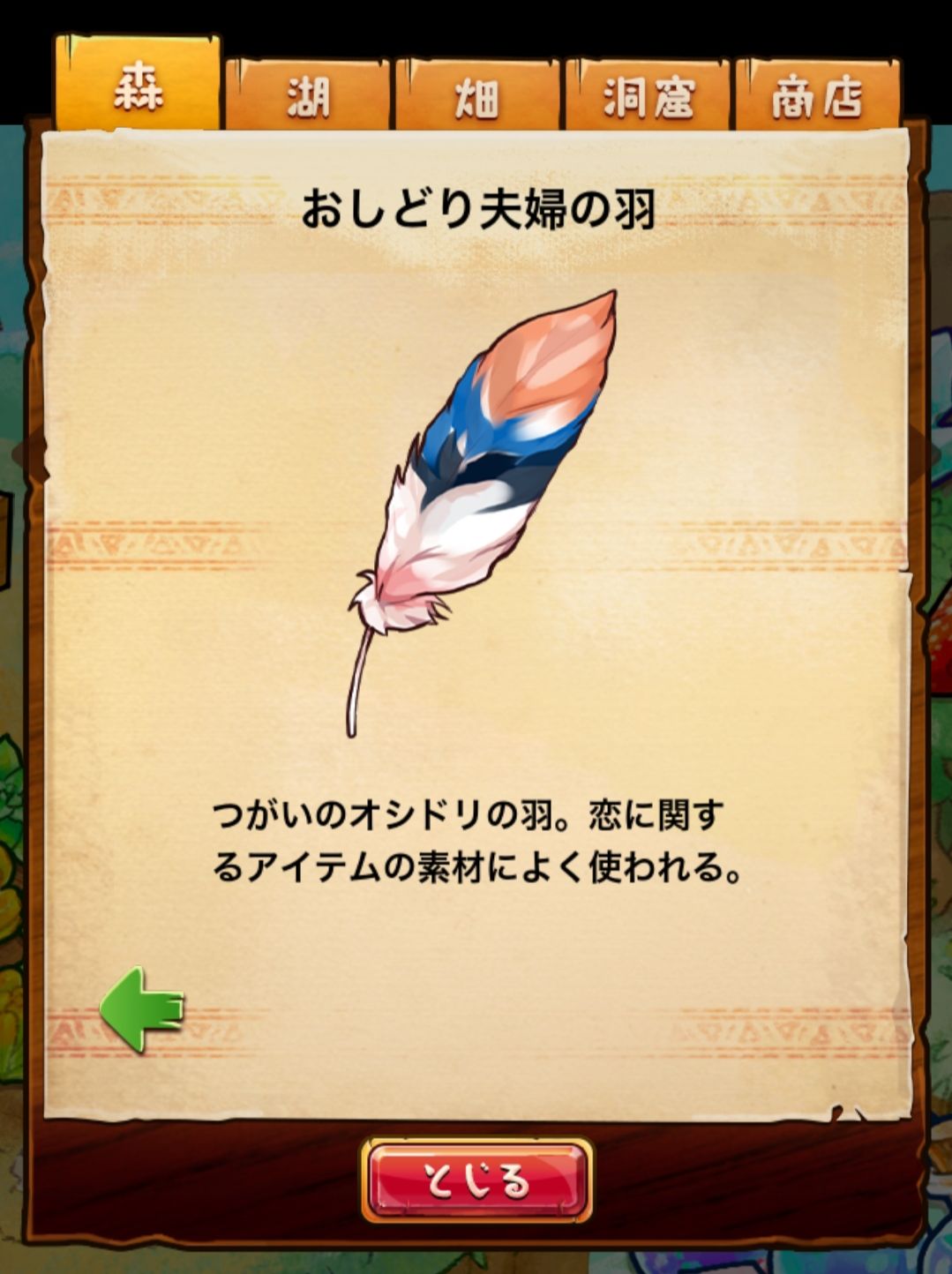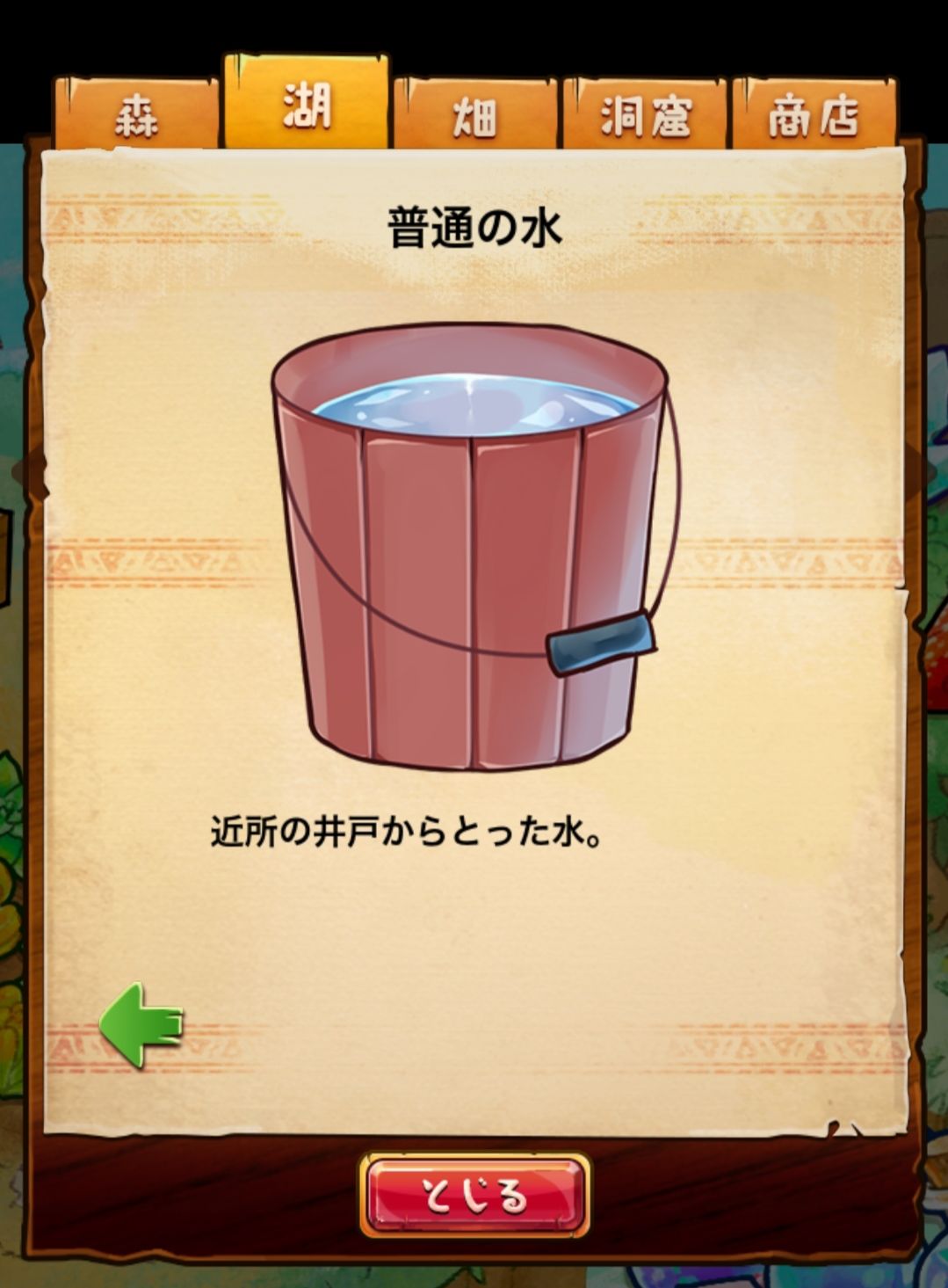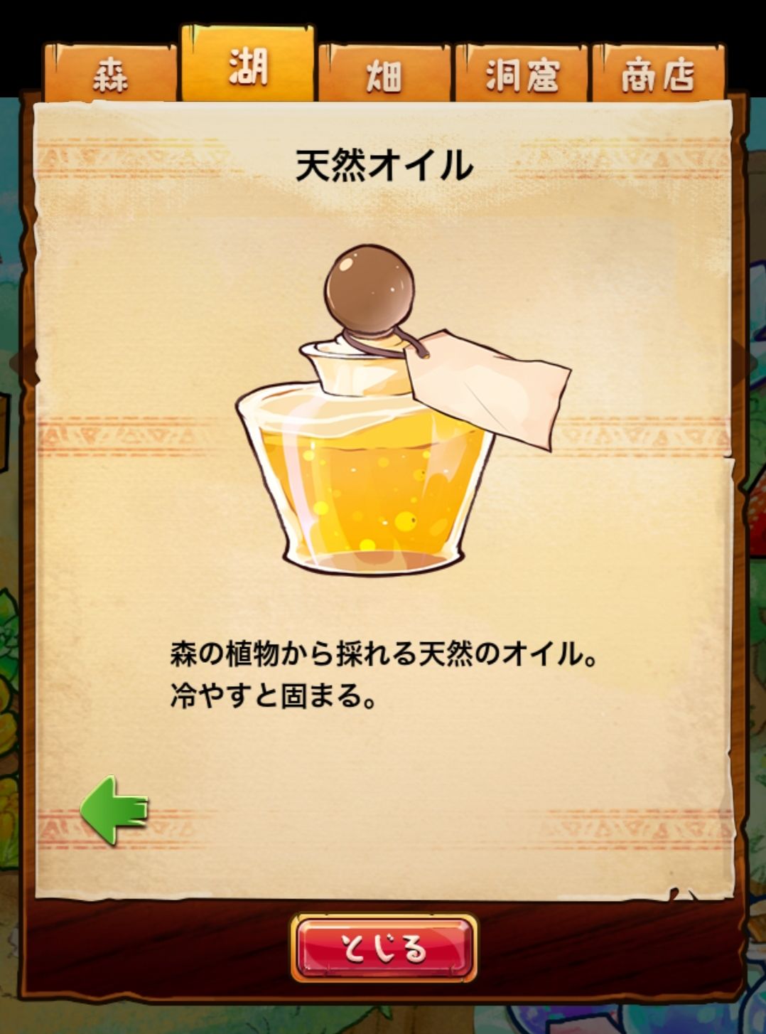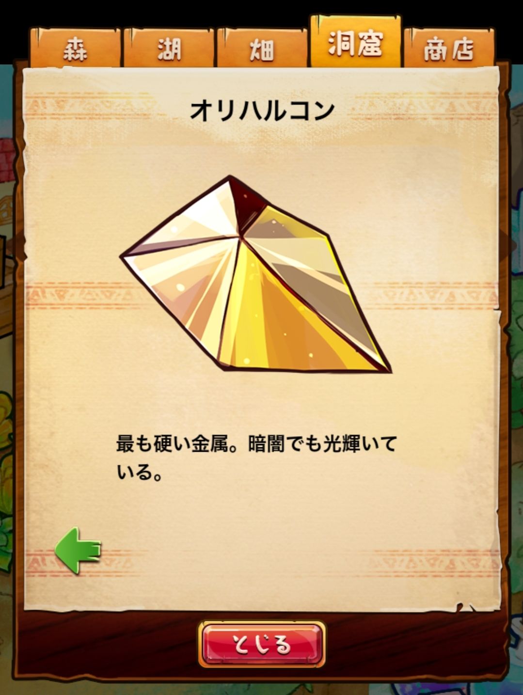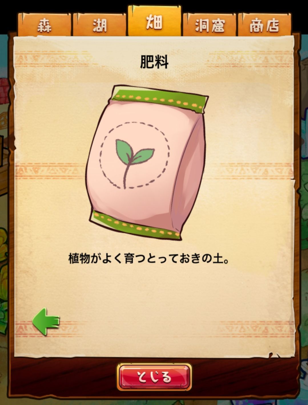 材料分五个地方: 森林,湖,田,洞窟和商店
