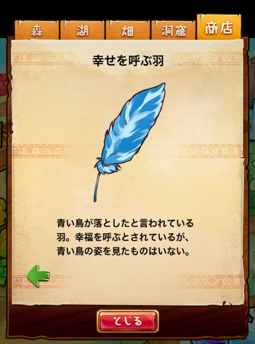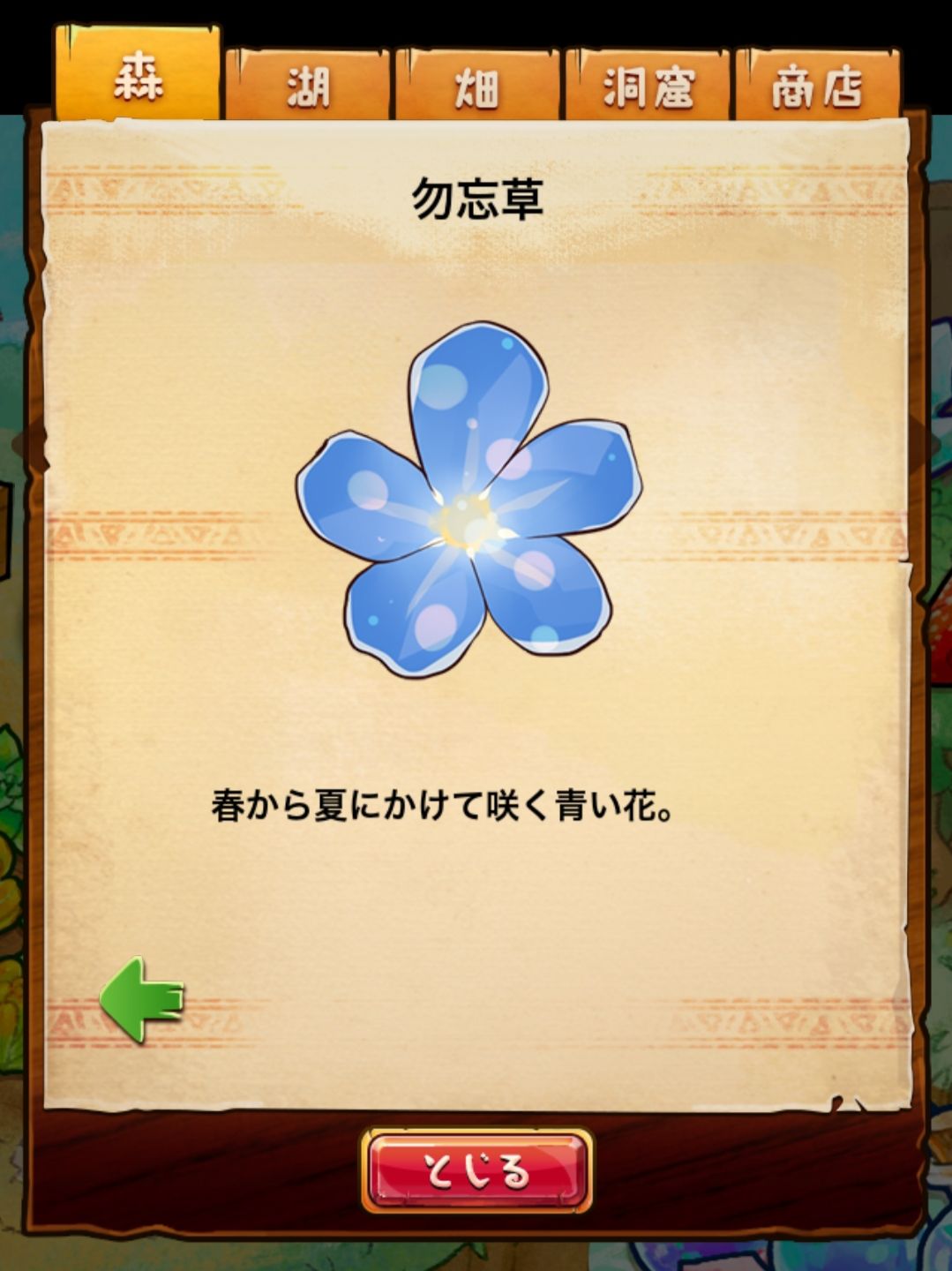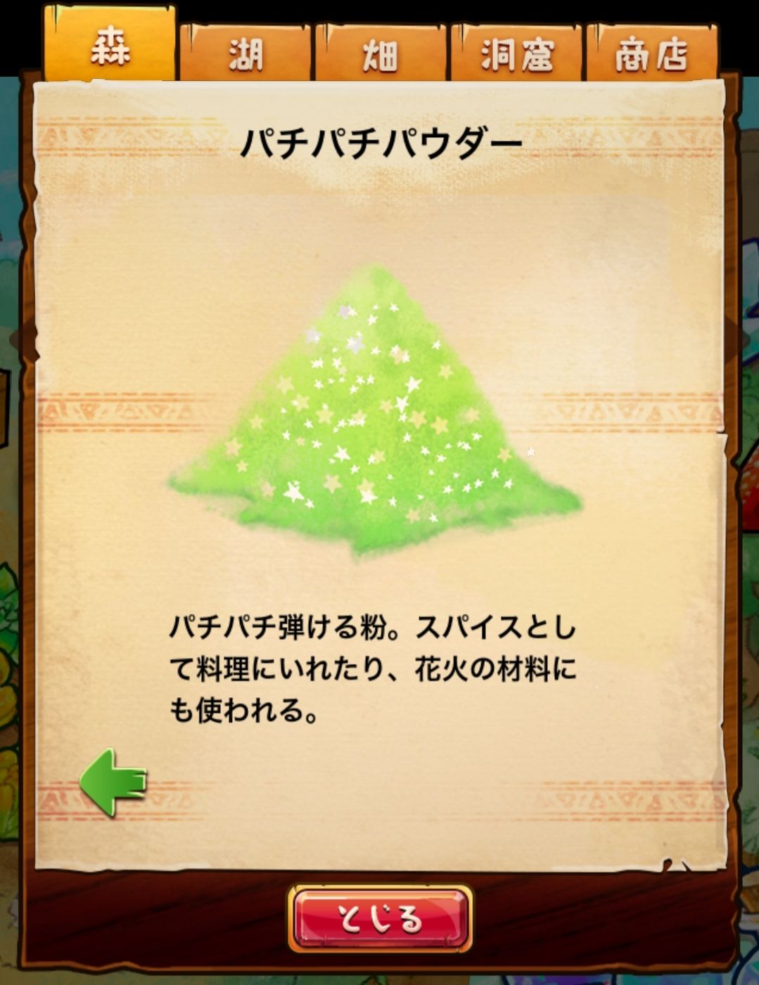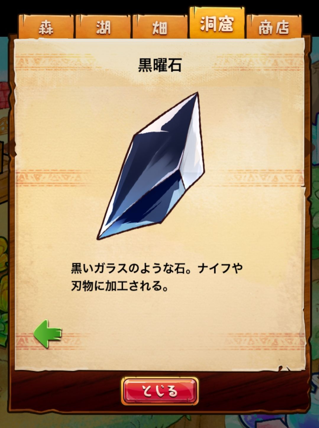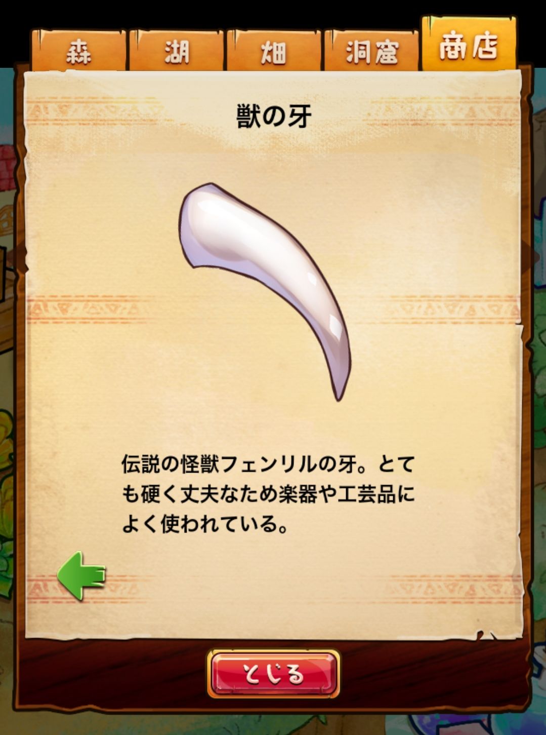 材料分五个地方: 森林,湖,田,洞窟和商店