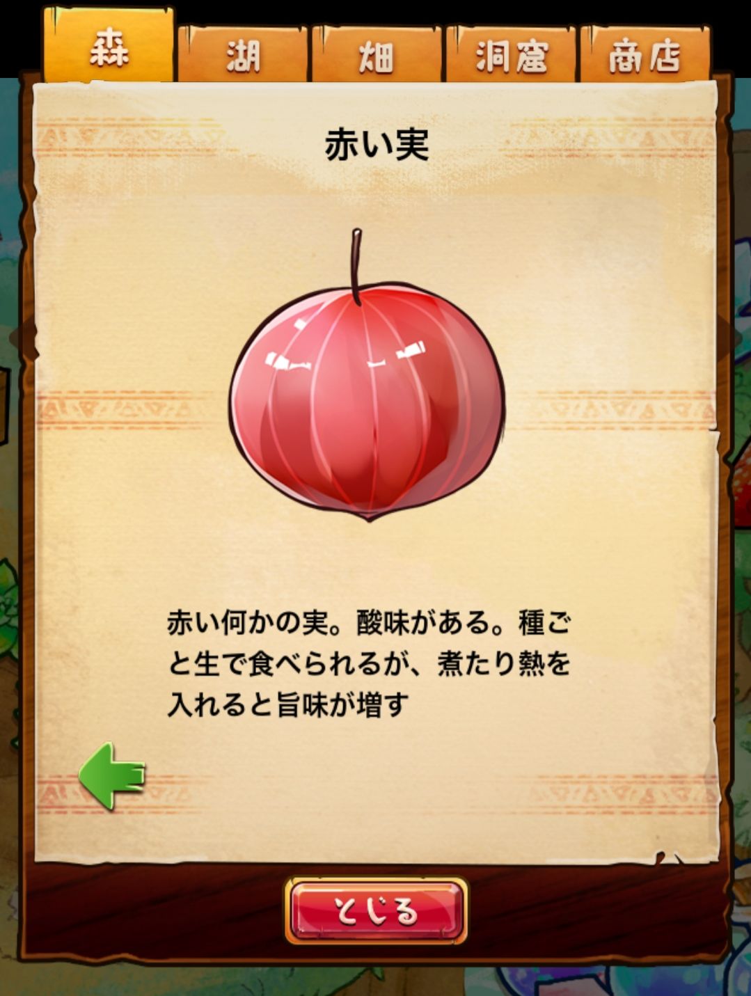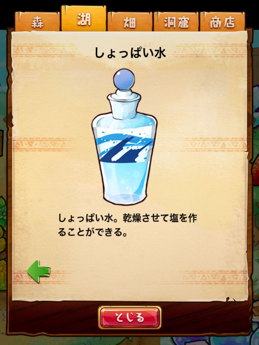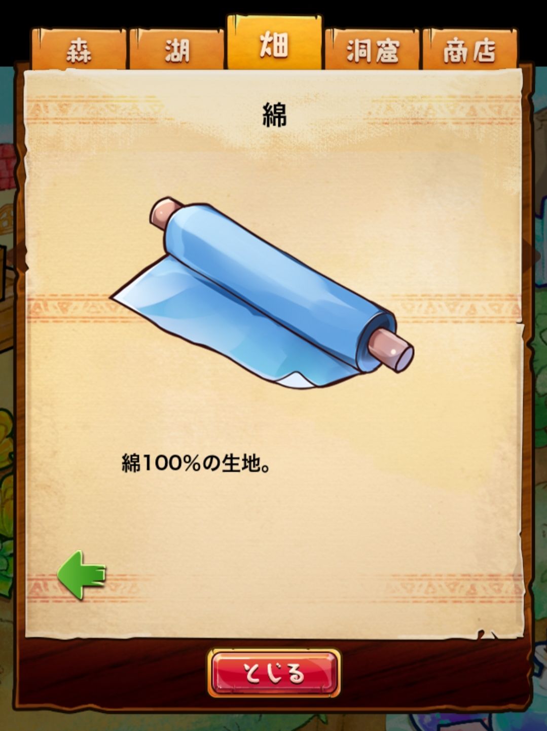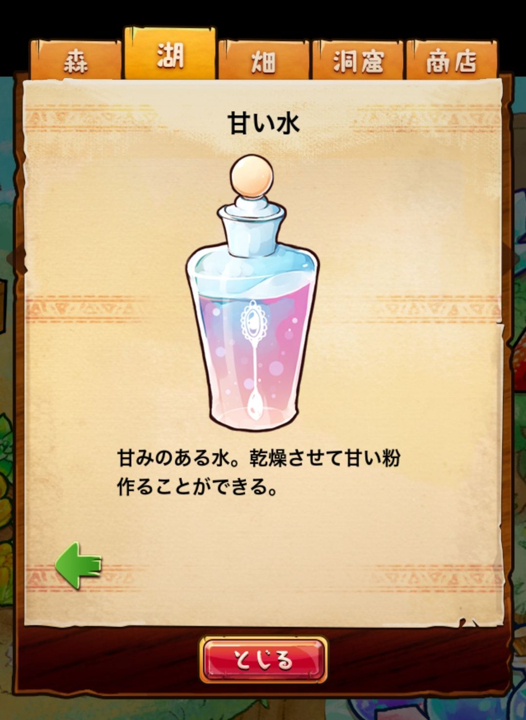 材料分五个地方: 森林,湖,田,洞窟和商店