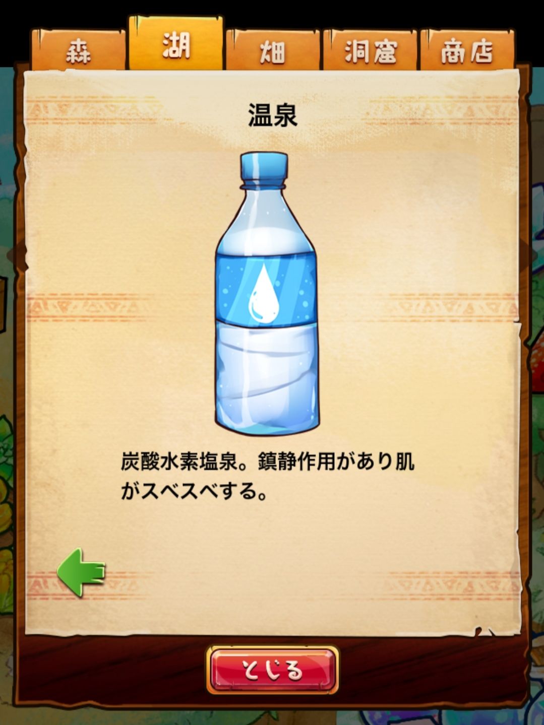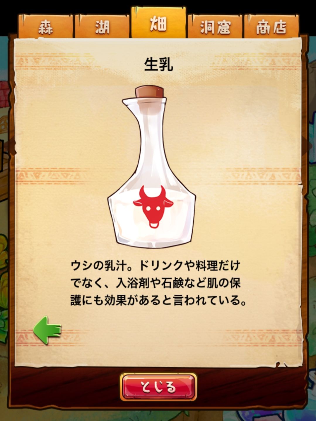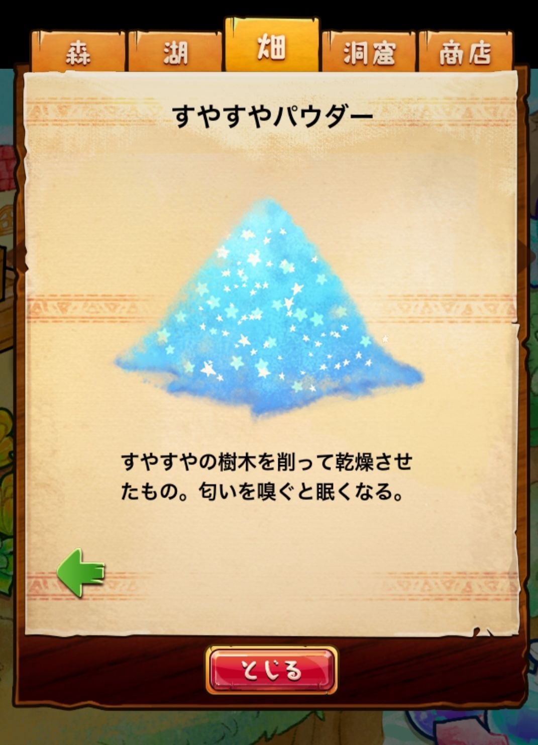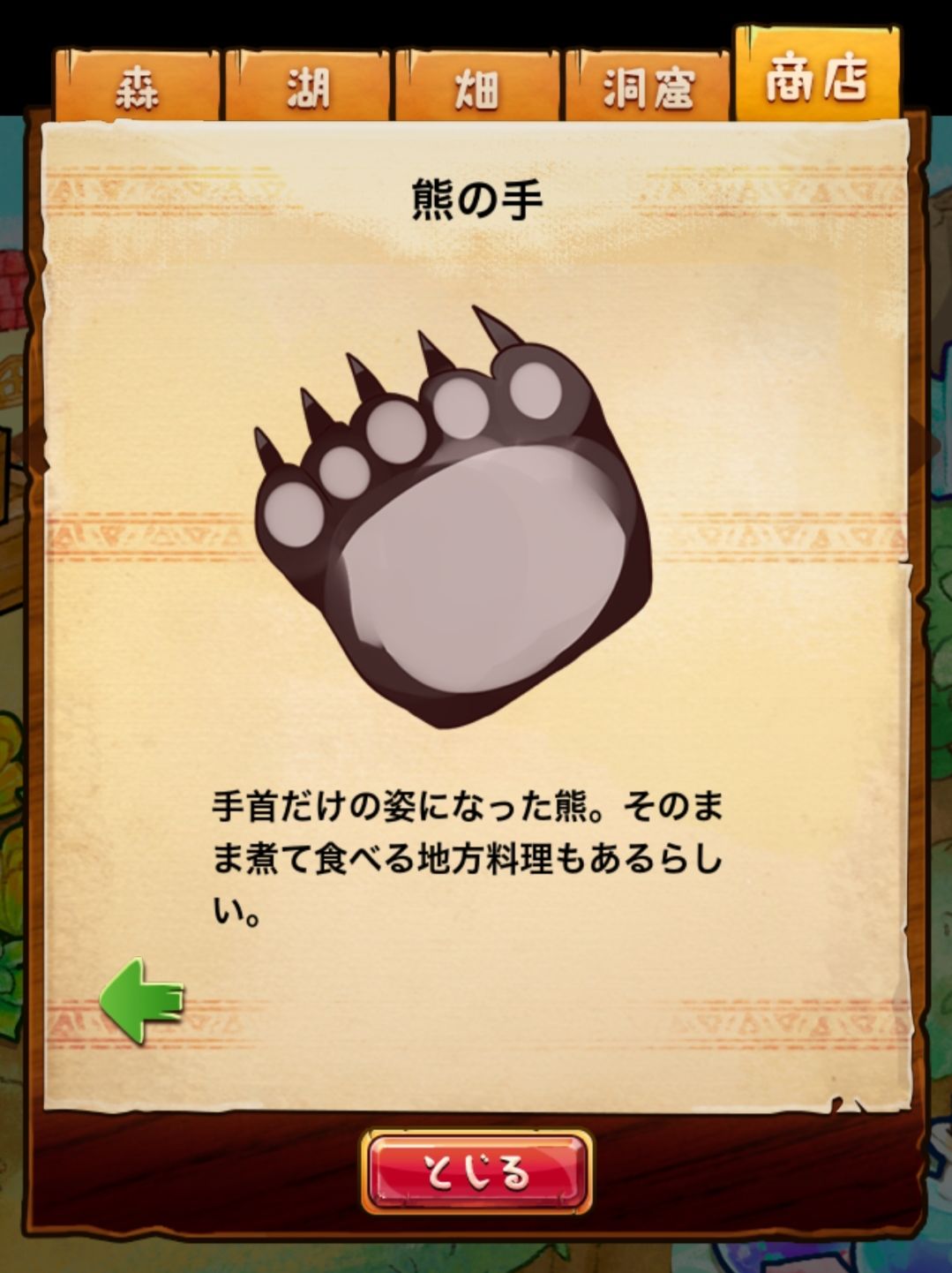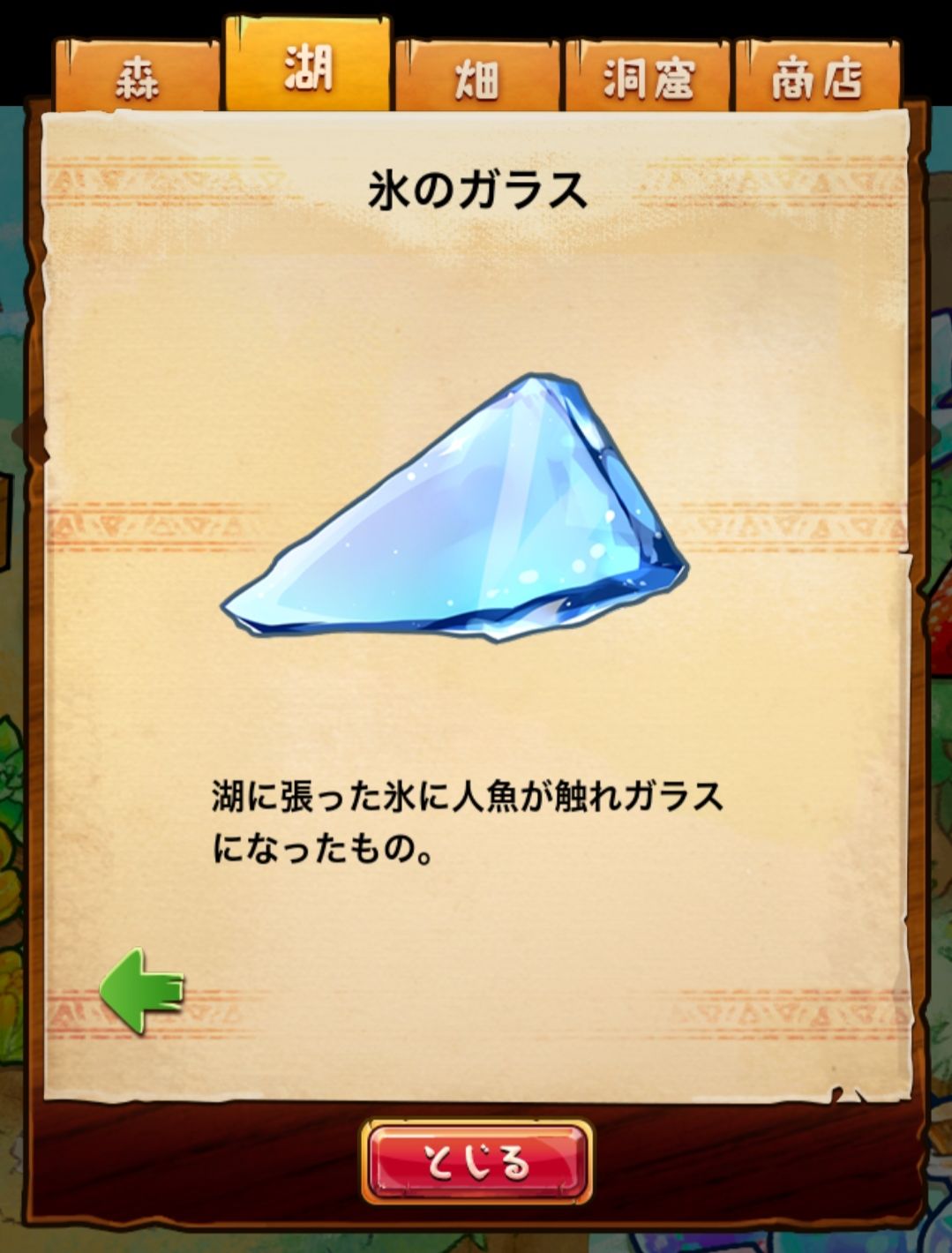 材料分五个地方: 森林,湖,田,洞窟和商店
