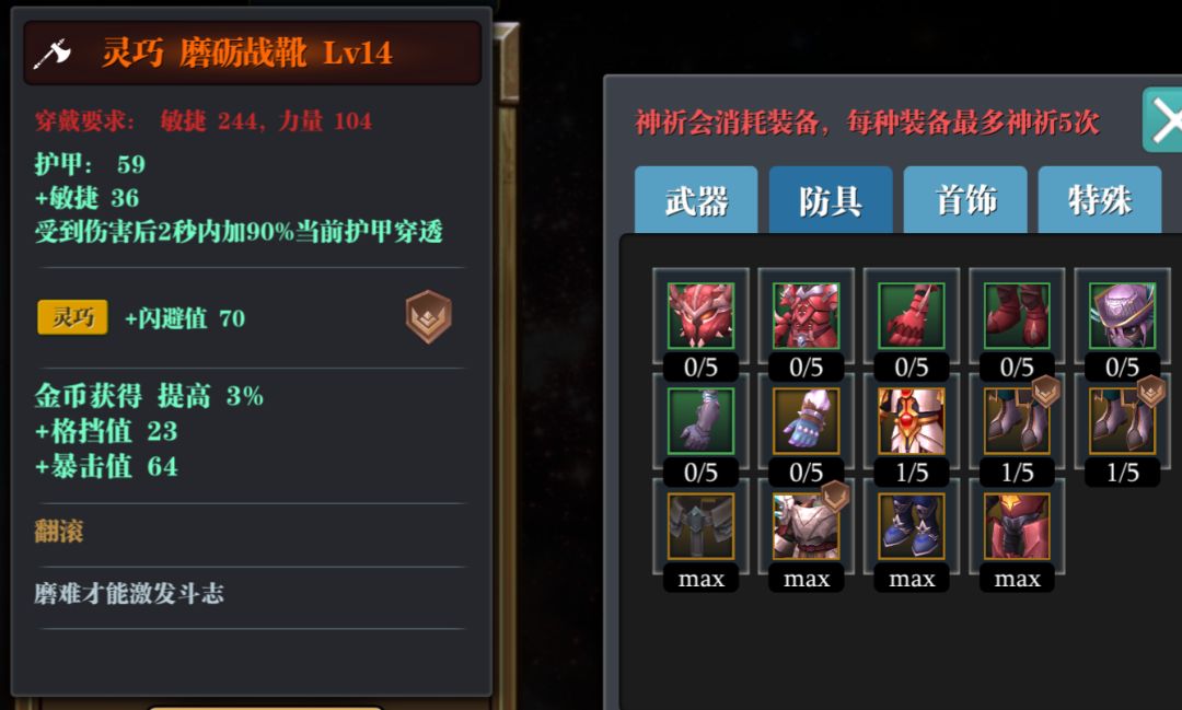 词缀一定要对,头衣服加血量,腰带鞋子加闪避值,破甲不够鞋子优先破甲!