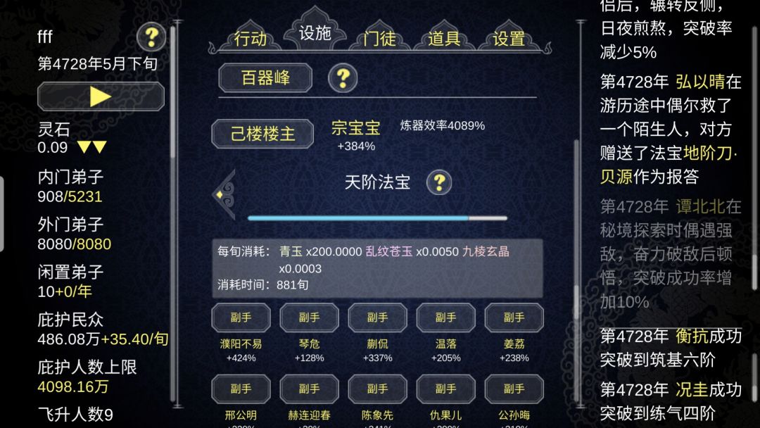 后期基本不需要丹药。因为一阶段一个丹药好麻烦,直接上装备100%突破率。所以我百器峰效率全开。