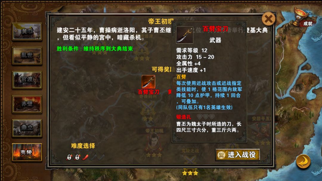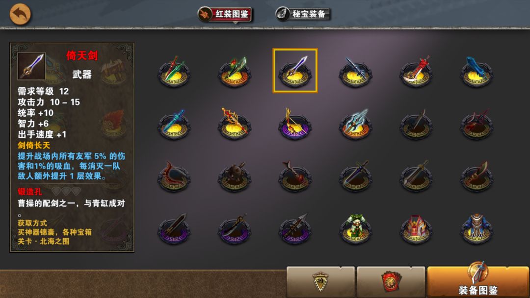群雄给了文官武将武器,那么北海给你的辅助一把好剑。倚天剑,曹操佩剑。高统中智,如刘备曹操孙权等辅助用挺合适,没武器文官武将需带兵时用也比黄装好。这把剑,越打越强,灭个两三组兵就比雌雄有一拼,全程被动给全军,有点吸血还适合打无损。在用辅助过地图时会经常用到。