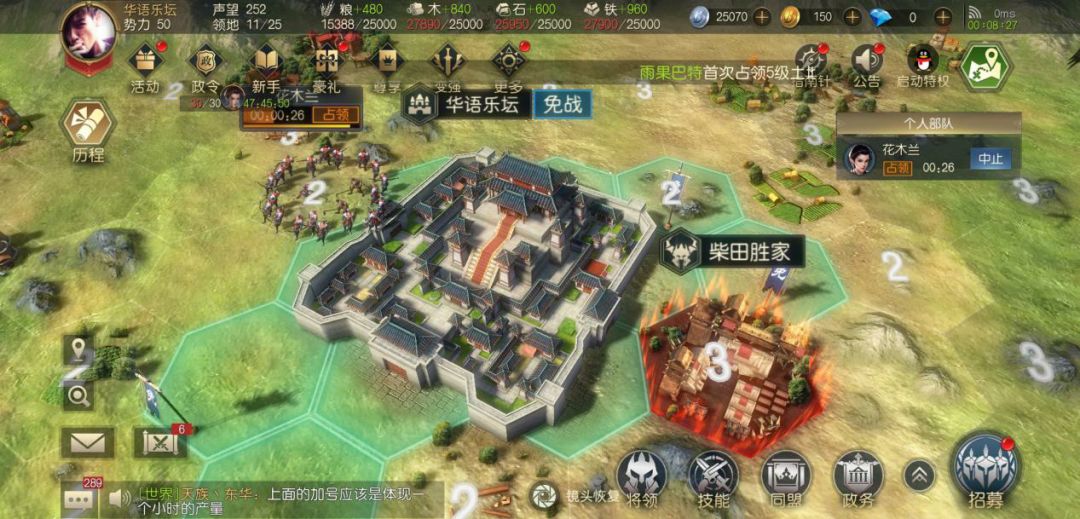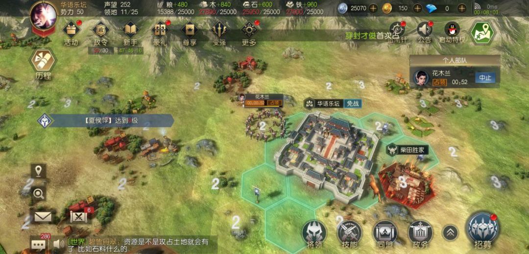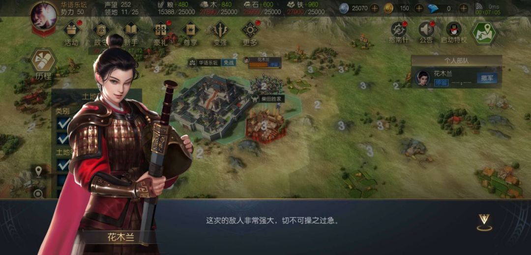一开始只有花木兰一个军队,后面就有了穆桂英,两个军队一起的开荒速度更加快了,每队都往不同的方向去开荒,要记住邻近的原则,因为其实军队行走的时间真的需要挺多的,人多走不太快,如果一直看着我都觉得有点累,都想帮忙走了,想要把部队往前推的感觉,但后面我知道了是我的问题,只要邻近选择地开荒就特别快速。