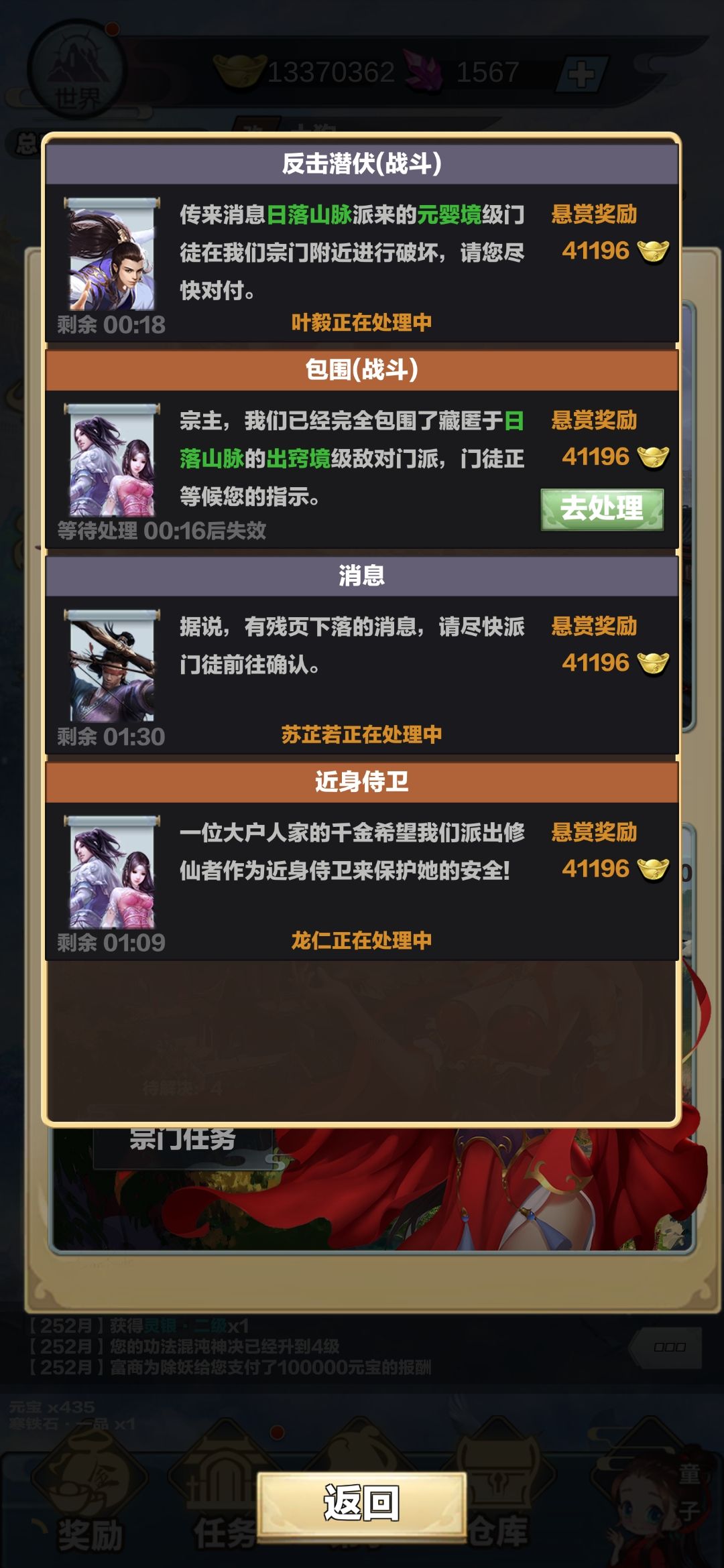 这样就是在修炼吗,我就没看到有弟子在这里提升资质的,这个连修炼状态都没有显示,还有宗门任务弟子一直不出来,一直显示处理中😓😓