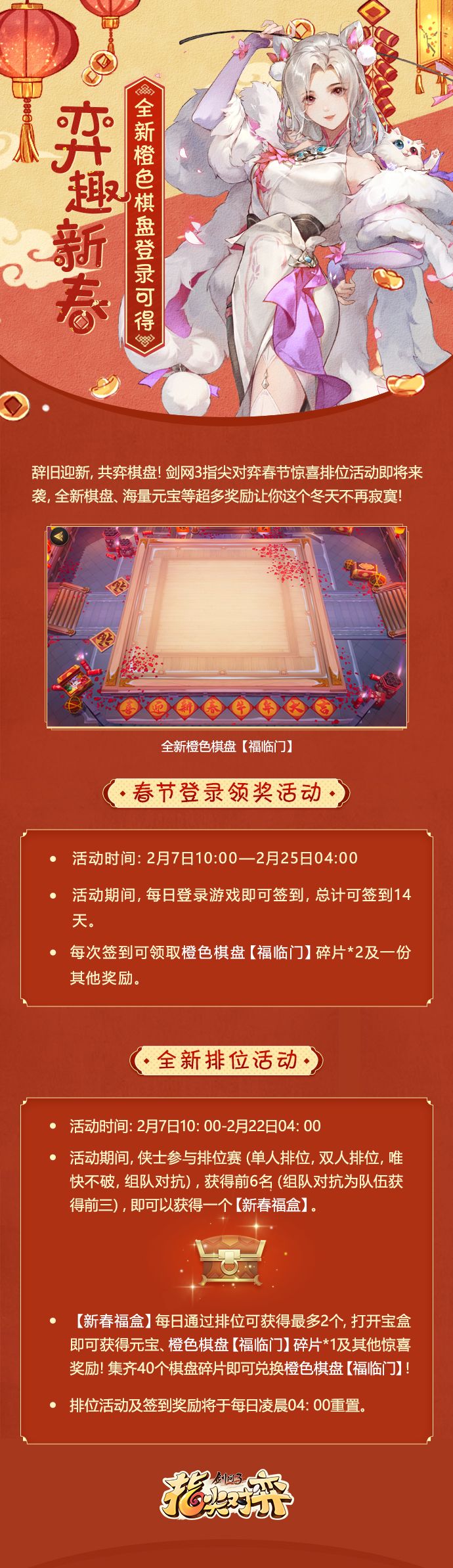 《剑网3指尖对弈》S3赛季“龙争虎斗”2月7日开启!新春活动将于当日10:00 开启!参与可得橙色春节棋盘【福临门】!