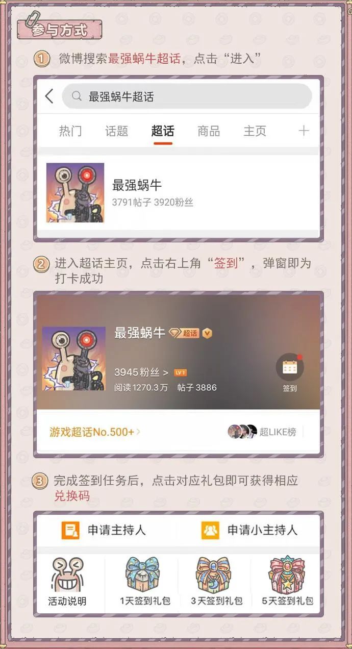 最强蜗牛微博超话签到福利开启啦,限时签到即领兑换码,记得关注官方微博@最强蜗牛手游!以后会不定期发放福利的!