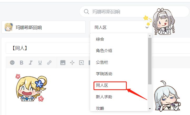 在玛娜希斯回响论坛投稿,并且选择子版块【同人区】进行投稿