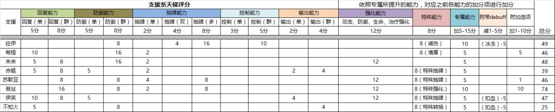 注:此评分标准是依据游戏本身对支援系的职业定位来划分的。其防御能力和回复能力的分值比重较大,输出以及控制能力的分值则作为次要条件。评分仅以角色能力划分,仅供参考。