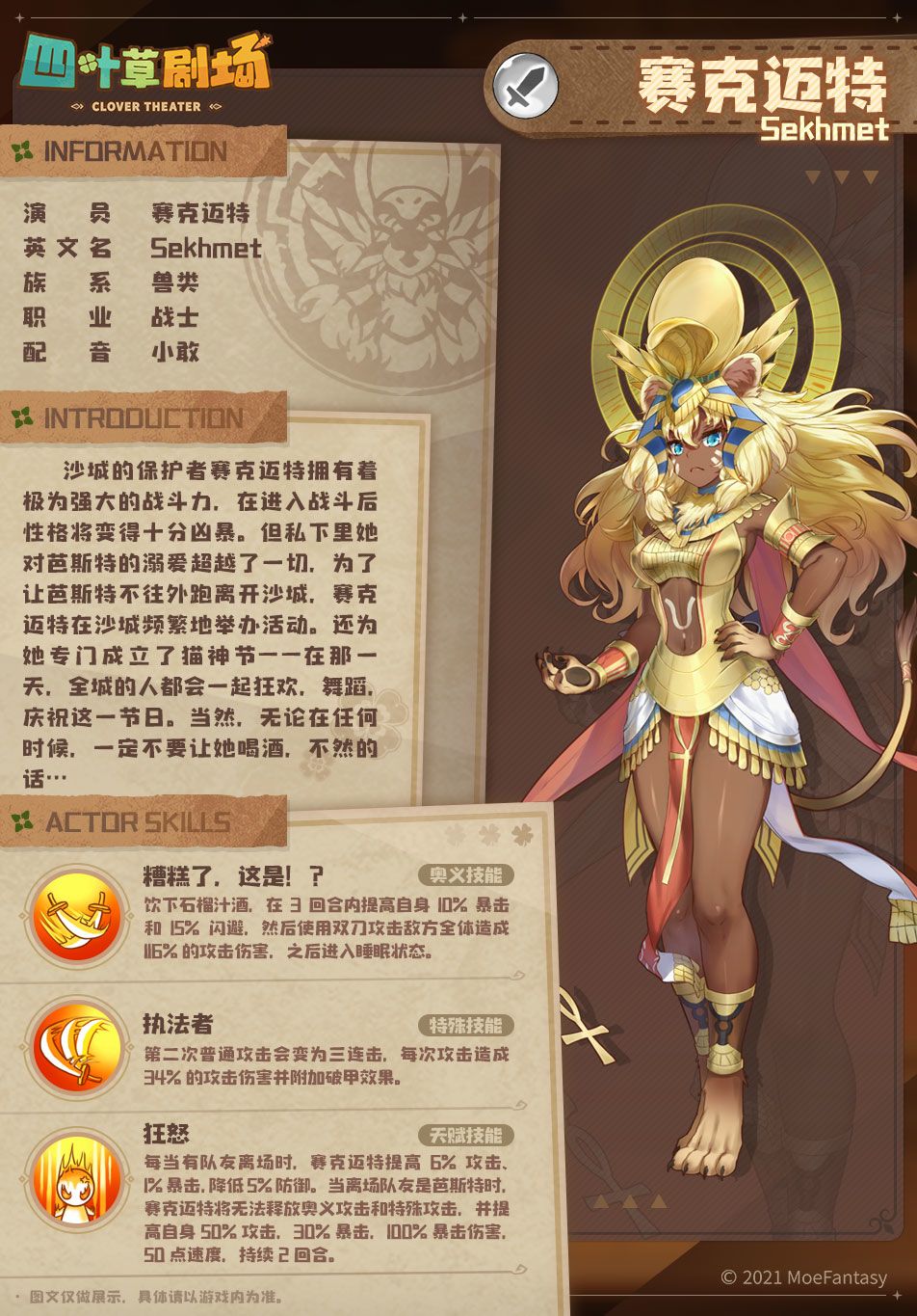 沙城的保护者赛克迈特拥有着极为强大的战斗力,在进入战斗后性格将变得十分凶暴。但私下里她对芭斯特的溺爱超越了一切,为了让芭斯特不往外跑离开沙城,赛克迈特在沙城频繁地举办活动。还为她专门成立了猫神节——在那一天,全城的人都会一起狂欢,舞蹈,庆祝这一节日。当然,无论在任何时候,一定不要让她喝酒,不然的话…