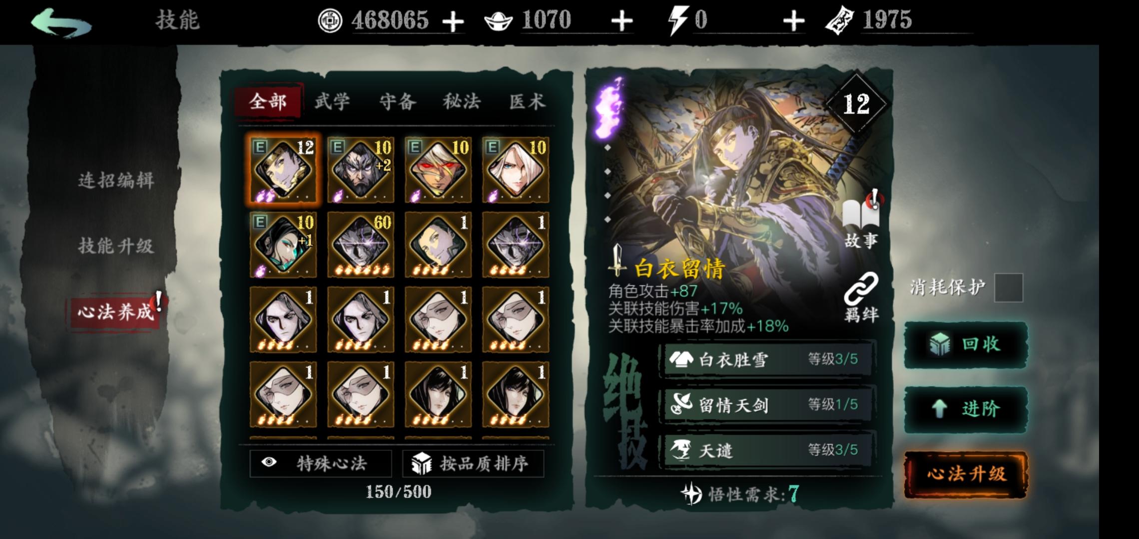 双卡双令华服,这是开服氪的。技能是自己搭配的,准备走飞天流。心法是魔堡羁绊,CD羁绊,黑白剑,紫卡唐门增伤,橙卡万魔增伤。
