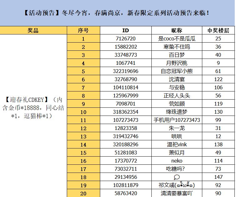 参与互动,我们将在2月1日抽20位小阁主送出【迎春礼CDKEY】(内含金币*18888,同心结*1,逗猫棒*1)