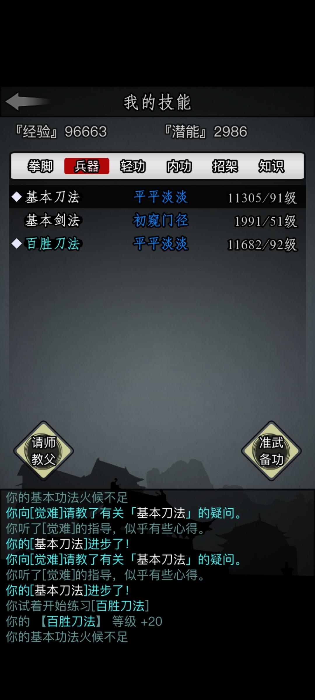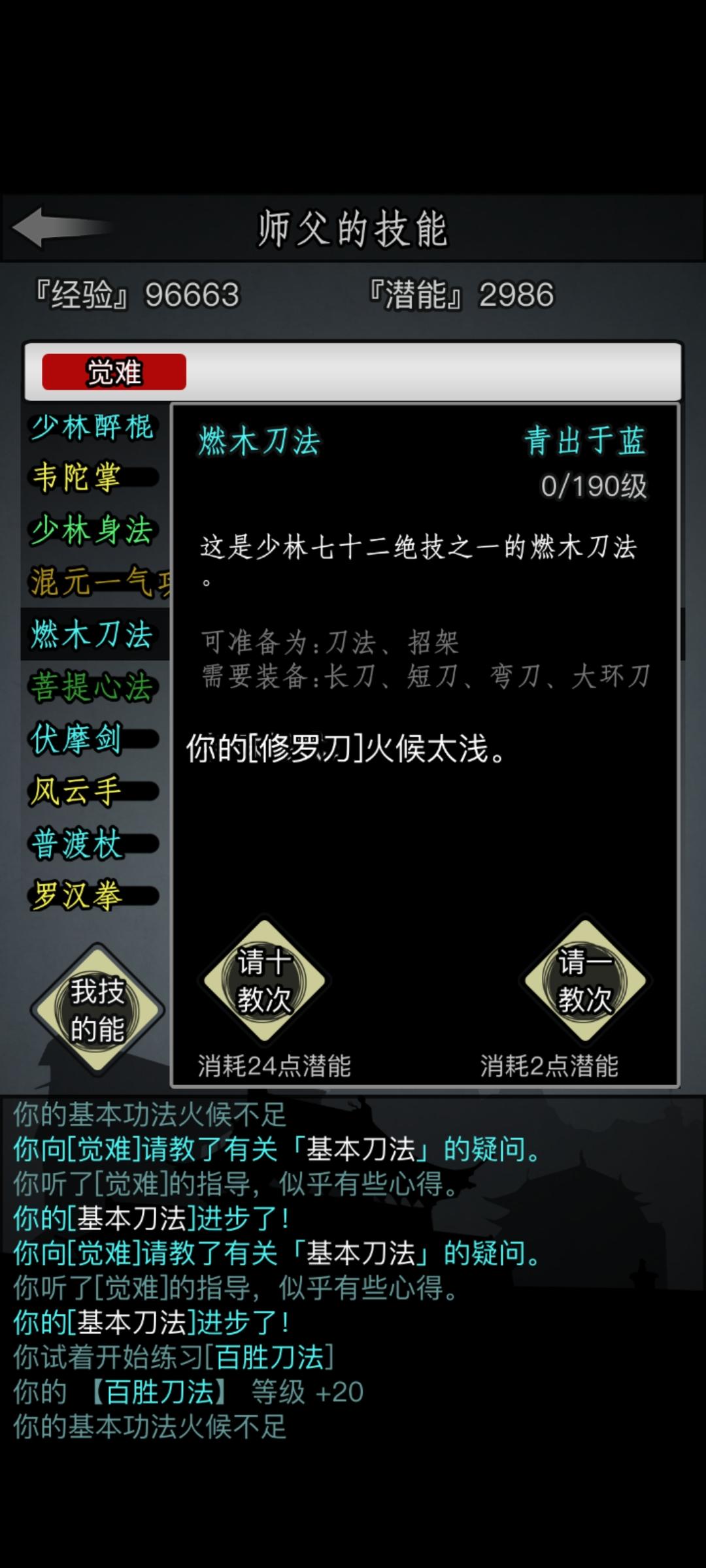 找了半天这个师傅还不教修罗刀?燃木刀法又要200级读书,只好当散人练胡家刀法😒