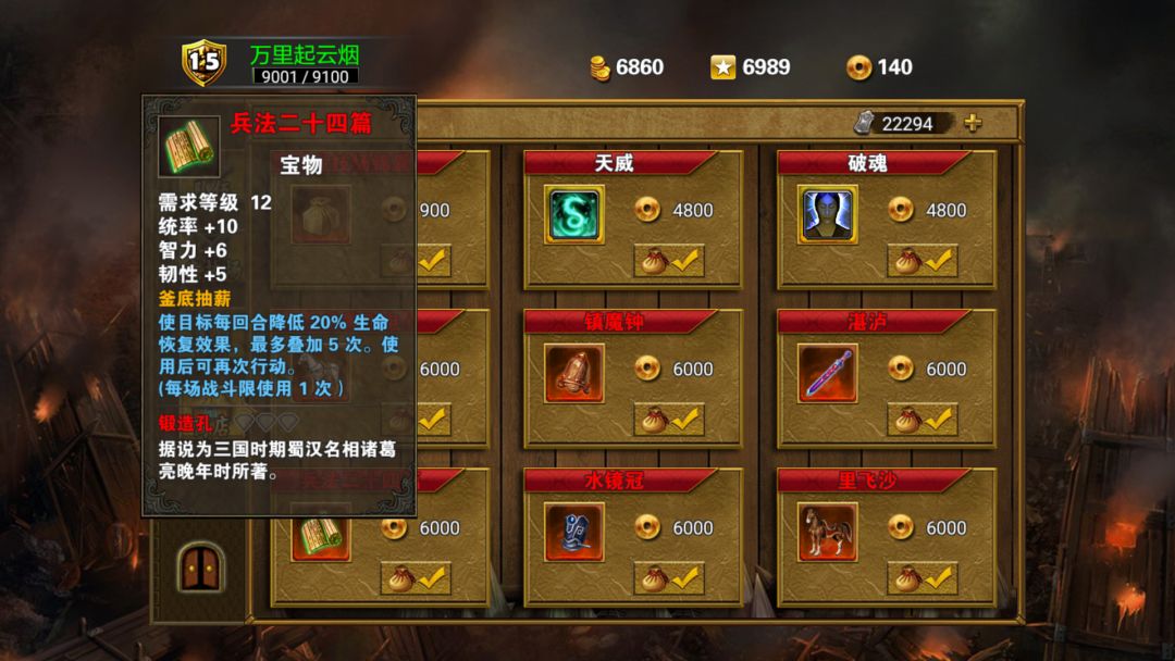 兵法二十四篇俗称兵书,降低治疗效果和狗链洋河鞋各有所长。高统中智贫血,更适合给辅助和法师使用。在竞技场中用现在容易被针对,敲掉该将debuf消失,被破掉。目前面对一些加血变态的副本会比较好用。另外,目标使用后可再次行动,即可用雷仗多动多打一次,也可以触发司马懿和莲花的连携攻击,对于这些特定搭配,爆发力还是不错的。