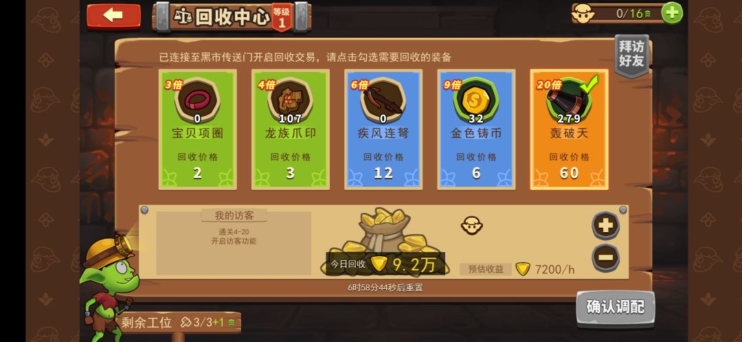 该收益需要建筑2级,哥布林数量18个左右,仓库>2000,操作过程中回收站哥布林可以暂时卸下 就这么简单,不懂评论问~