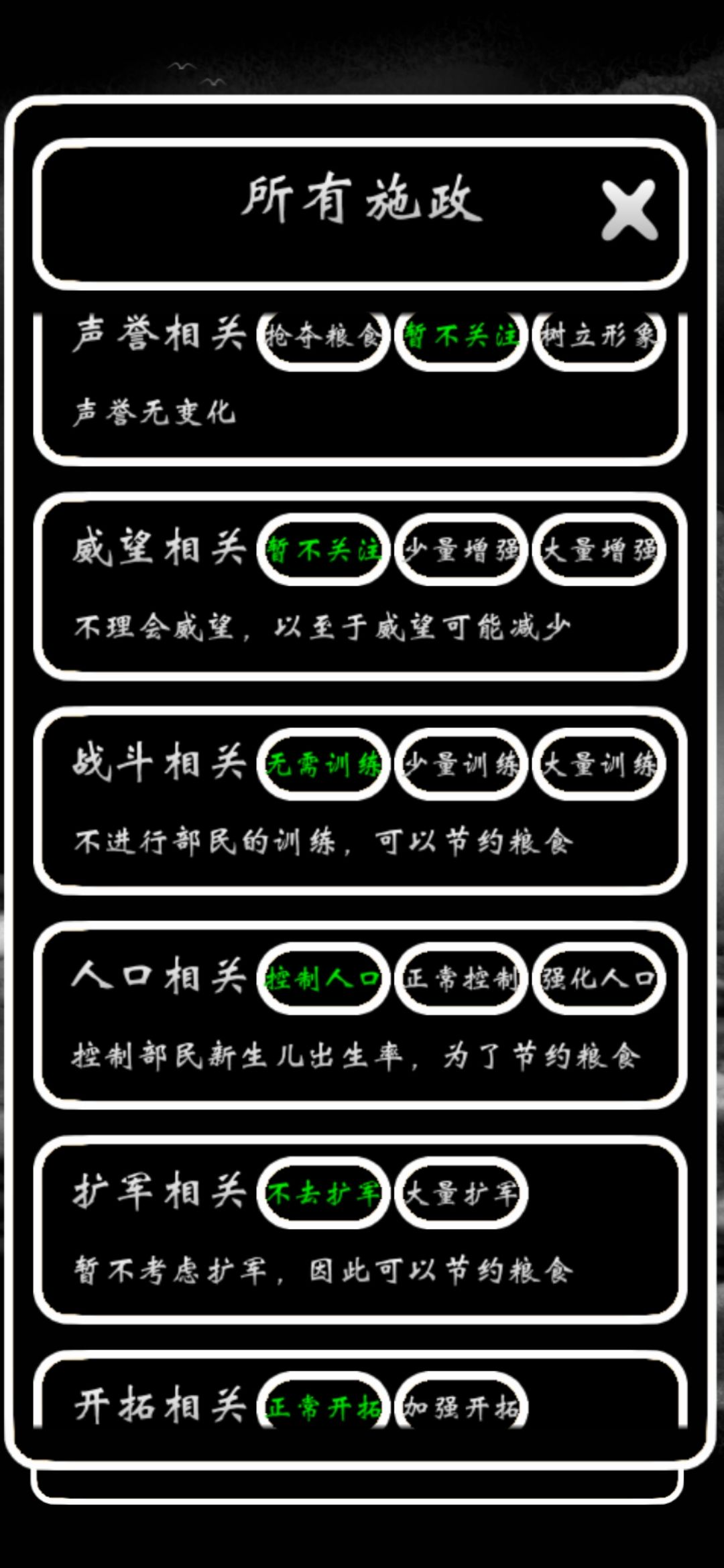 我自己是刚玩到20年有点腻了,战力后期不知道为啥不自动提升了,开了大量训练也是,只能通过增加人口提升战力,但人口涨太慢,人口数量成长性不随人口基数增加而增加,每个月还是几百人。倒是劫难已经不是问题了,每种资源只要有时间随便都能刷。