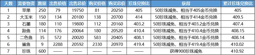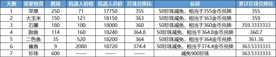 原先预估共计减免=25*50+5*300=2750。但虫套价值5888,减去2750也需要3138,也就是缺口138珍珠。估计这138珍珠会分配到剩下四次的上交中或者归到最后一天的上交珍珠中。也就是预计5次要上交3138珍珠。