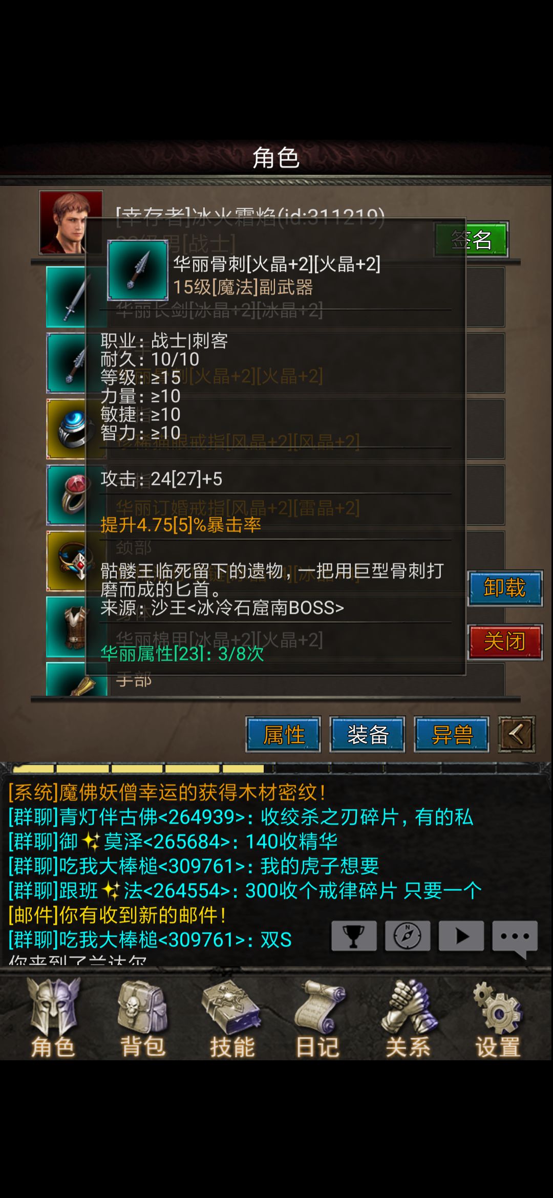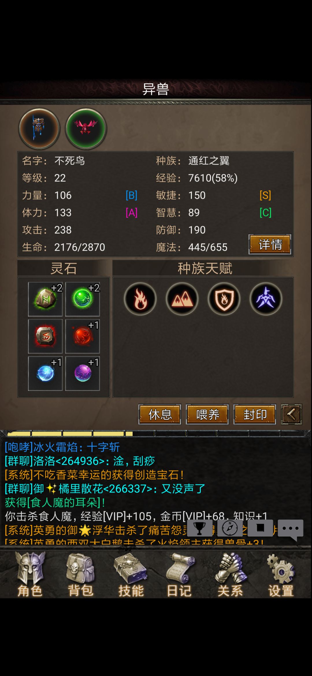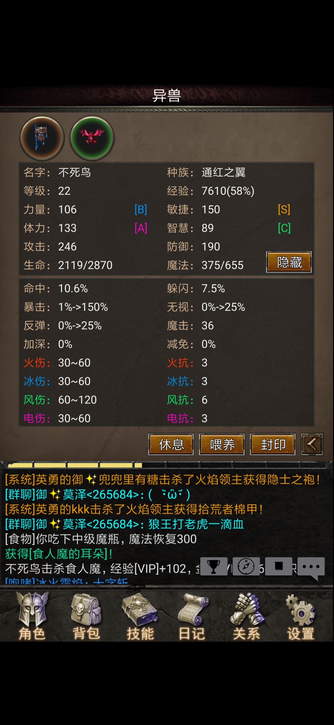 宠物升级主要靠喂挂机出来的材料,这只通红之翼今天早上还是1级,我给他喂了昨晚挂机牛头怪的牛角和牛头怪的蛋蛋,等级直接飙到22级,不想自己打材料的也可以在拍卖行买