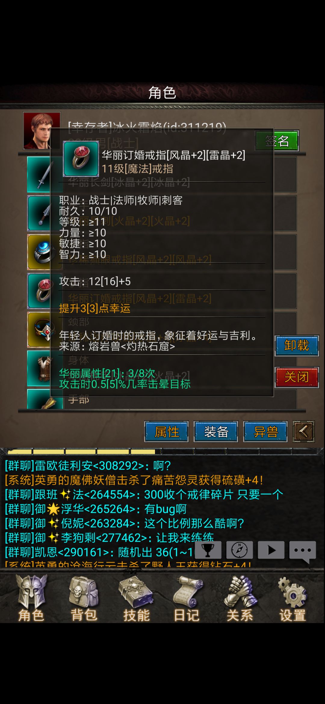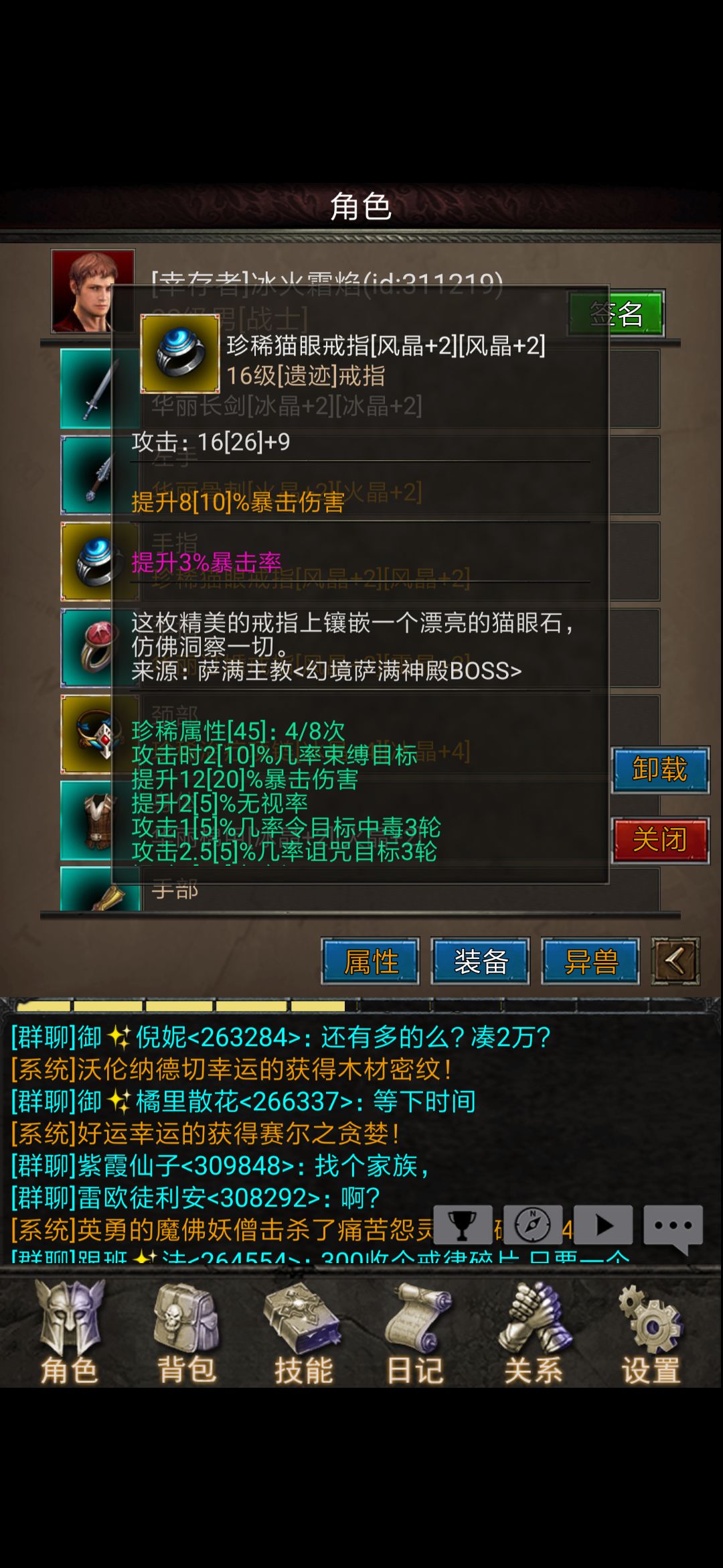 戒指:11级订婚戒指——>16级猫眼戒指(萨满boss出品,不过几率有点低,我打了十次都没出),拍卖行都可以买到,根据自己情况来,有钱就双猫眼戒指,没钱就双订婚戒指(后边会说如何赚黑金,下边这个猫眼戒指是我60黑金买的)